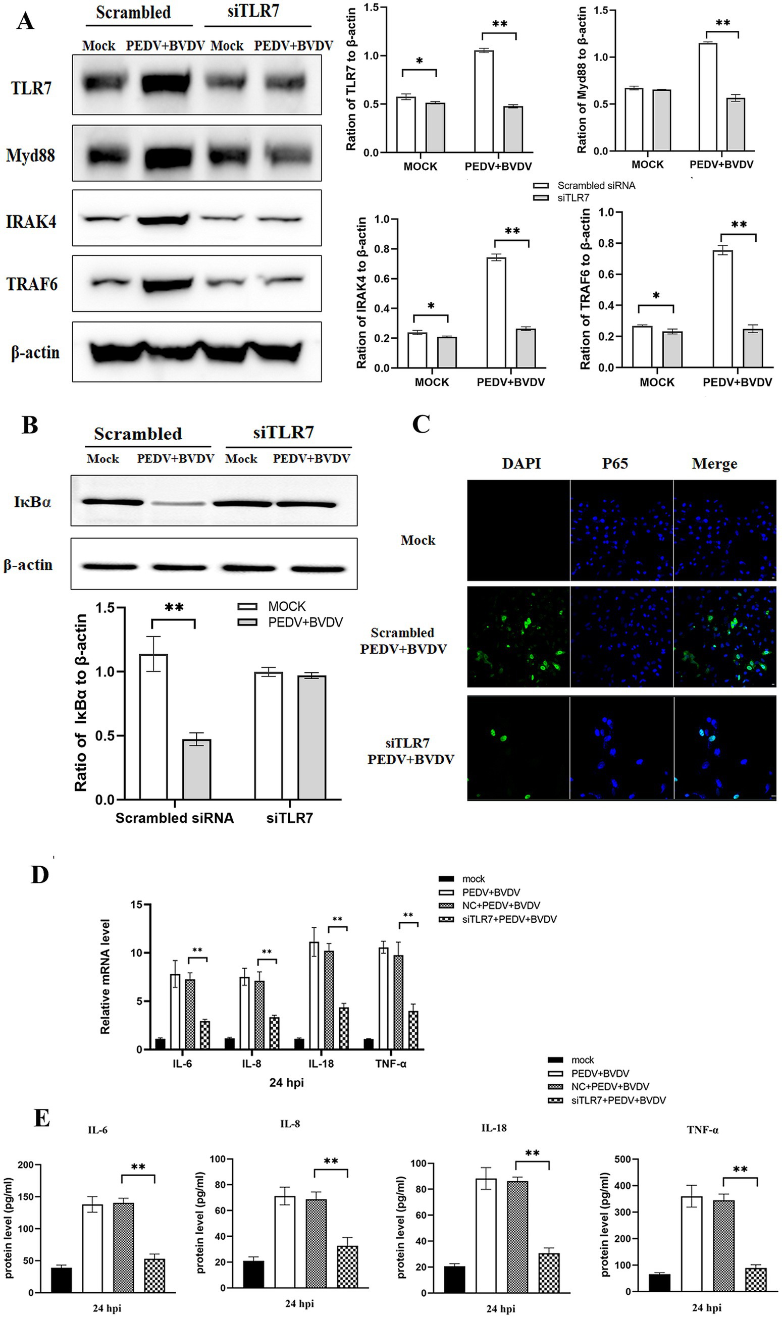 Figure 4. PEDV and BVDV coinfection induces NF-κB activation through the TLR7/Myd88 pathway. PK-15 cells were transfected with scrambled siRNA or siRNA specific for TLR7 (100 nmoL/mL) for 48 h and then coinfected with PEDV and BVDV for 24 h. (A) TRL7, Myd88, IRAK4, and TRAF6 expression was analyzed via Western blotting. (B,C) IκBα degradation and NF-κB p65 translocation were detected by Western blotting (B) and IFA (C). (D) The relative expression levels of IL-6, IL-8, IL-18, and TNF-α were quantified by qPCR. (E) The cell supernatants were collected for detection of IL-6, IL-8, IL-18, and TNF-α using ELISA. The results are representative of three independent experiments (*p < 0.05 and **p < 0.01).
