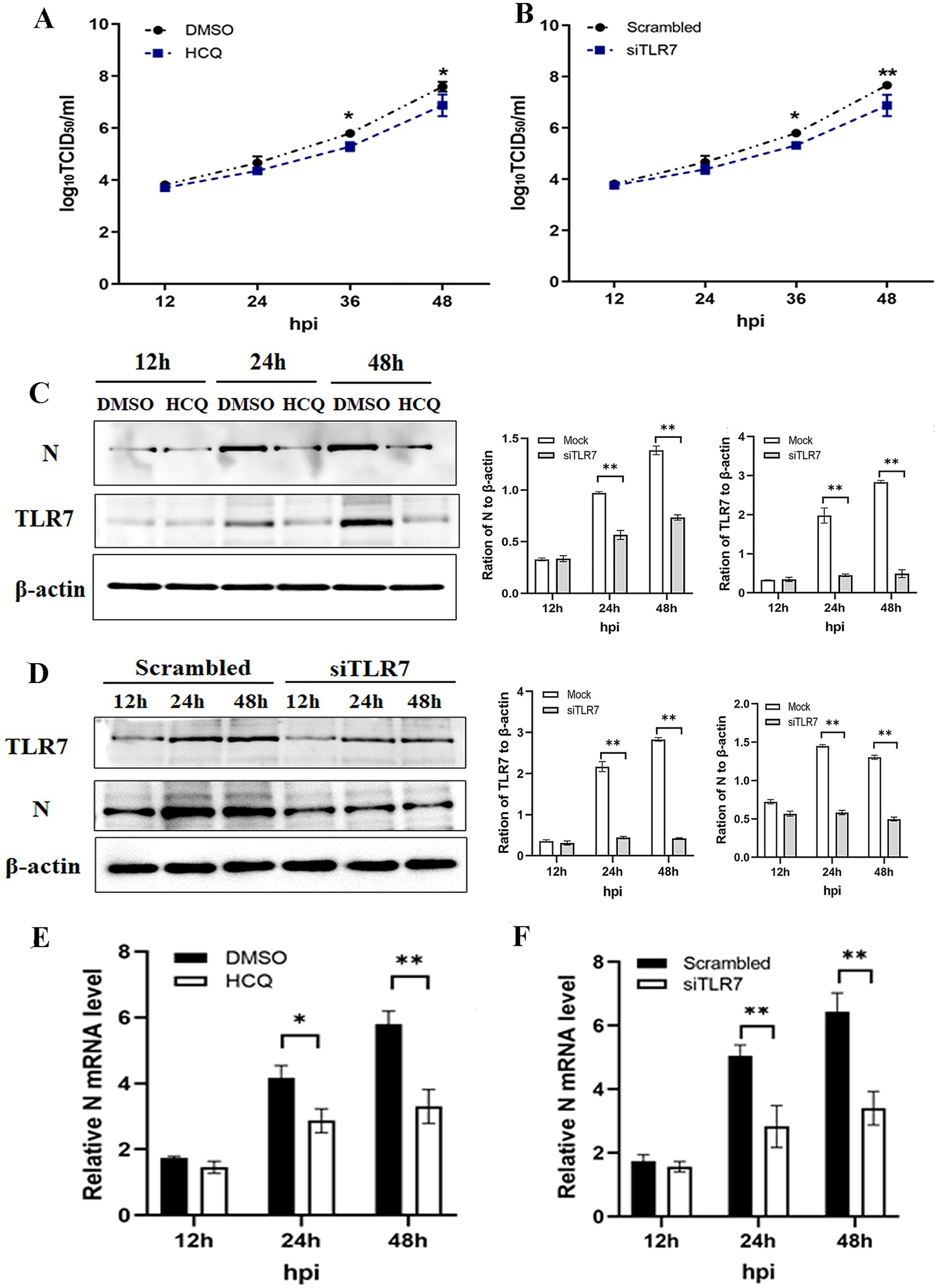Graphs and Western blot images analyze the effects of HCQ and siTLR7 on viral replication. Panel A and B compare TCID50 levels over time in the presence of DMSO, HCQ, scrambled, and siTLR7. Panels C and D show protein expression levels of N and TLR7 with β-actin as a control across different time points. Bar graphs quantitatively represent these protein ratios. Panels E and F display relative N mRNA levels, indicating significant changes with treatments. Asterisks denote statistical significance.