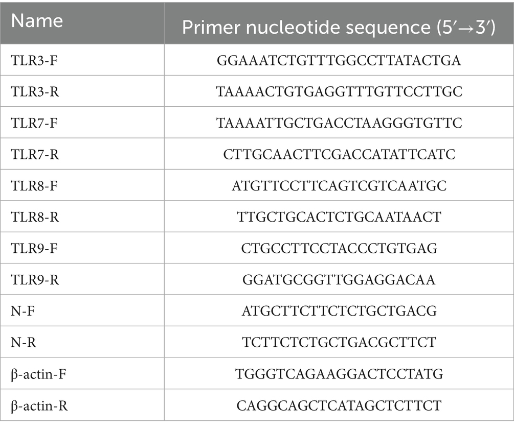 PEDV strain JS-2/2014, BVDV-2 strain SH-28 and PK15 cells were prepared as previously described (Cheng et al., 2022). The cells were grown in DMEM (Gibco, Grand Island, NY, United States) supplemented with 10% fetal bovine serum (FBS) (Gibco) at 37 °C and 5% CO2. Hydroxychloroquine (HCQ) sulfate, a small molecule inhibitor of TLR7 was purchased from Selleck (Houston, TX, United States) (Lamphier et al., 2014). A Toll-like Receptor Antibody Kit (48697), and antibodies against p65 (8242), Myd88 (4283), IRAK4 (4363), TRAF6 (8028), and β-actin (3700) were purchased from Cell Signaling Technology (Danvers, MA, United States). The polyclonal antibody against BVDV E2 protein was purchased from Bioss Biotechnology (Beijing, China). The monoclonal antibody against the PEDV N protein was purchased from BioNote (Hwaseong-si, South Korea).