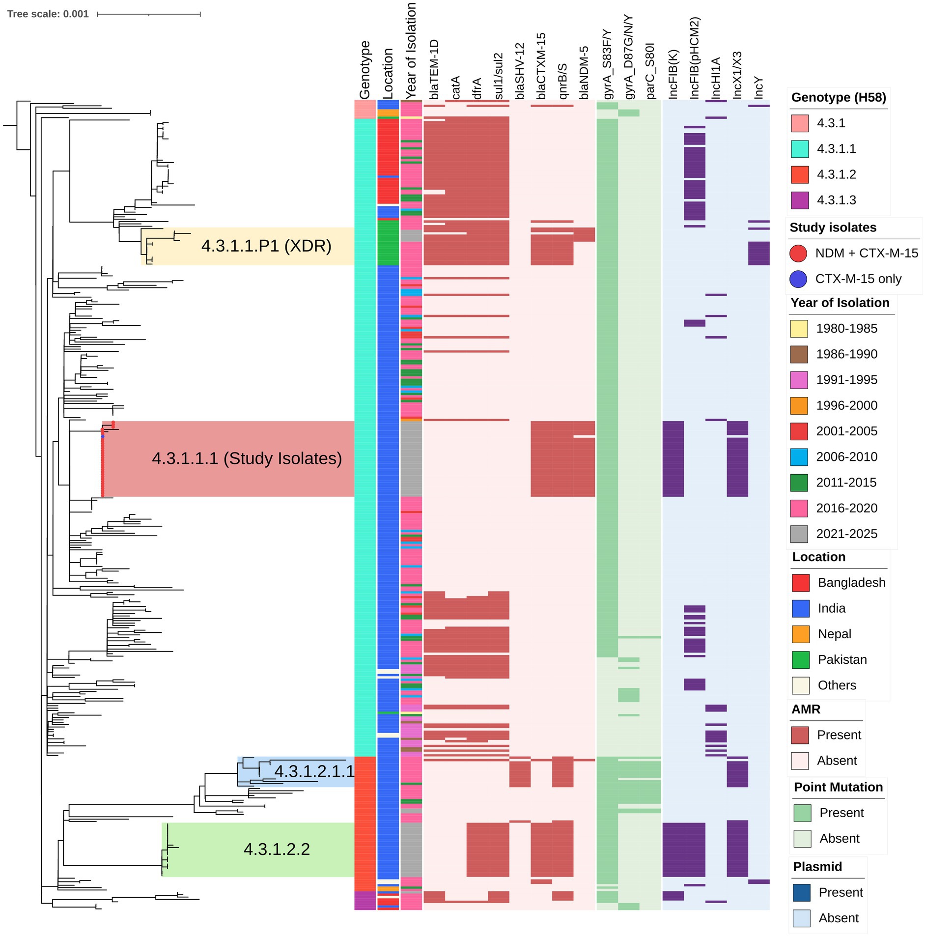 Genomic surveillance is a key tool for monitoring AMR transmission and tracking outbreaks of S. Typhi (Baker et al., 2018). The GenoTyphi scheme provides a robust framework for classifying S. Typhi into four major lineages and over 75 genotypes, enabling the identification of distinct transmission pathways on a global scale (Wong et al., 2016; Dyson and Holt, 2021). Among these, haplotype 58 (H58, genotype 4.3.1) has become the dominant strain worldwide, primarily due to its enhanced transmissibility and MDR (Wong et al., 2015; Pragasam et al., 2020; Carey et al., 2024). Within this lineage, key subclades include 4.3.1.1, associated with MDR, 4.3.1.2, linked to FQNS, and 4.3.1.3, which predominates in Bangladesh, providing critical epidemiological insights into the evolution and spread of drug-resistant typhoid (Carey et al., 2023). Further the GenoTyphi framework has proven effective in managing outbreaks of drug-resistant S. Typhi. For instance, the XDR S. Typhi outbreak in Pakistan, attributed to subclade 4.3.1.1.P1, was tracked using this scheme (Klemm et al., 2018). Similarly, ceftriaxone-resistant S. Typhi outbreaks in India, including in Mumbai (subclade 4.3.1.2.1) and Vadodara (4.3.1.2.2) were effectively tracked and characterized (Jacob et al., 2021; Thirumoorthy et al., 2025; Argimón et al., 2022).