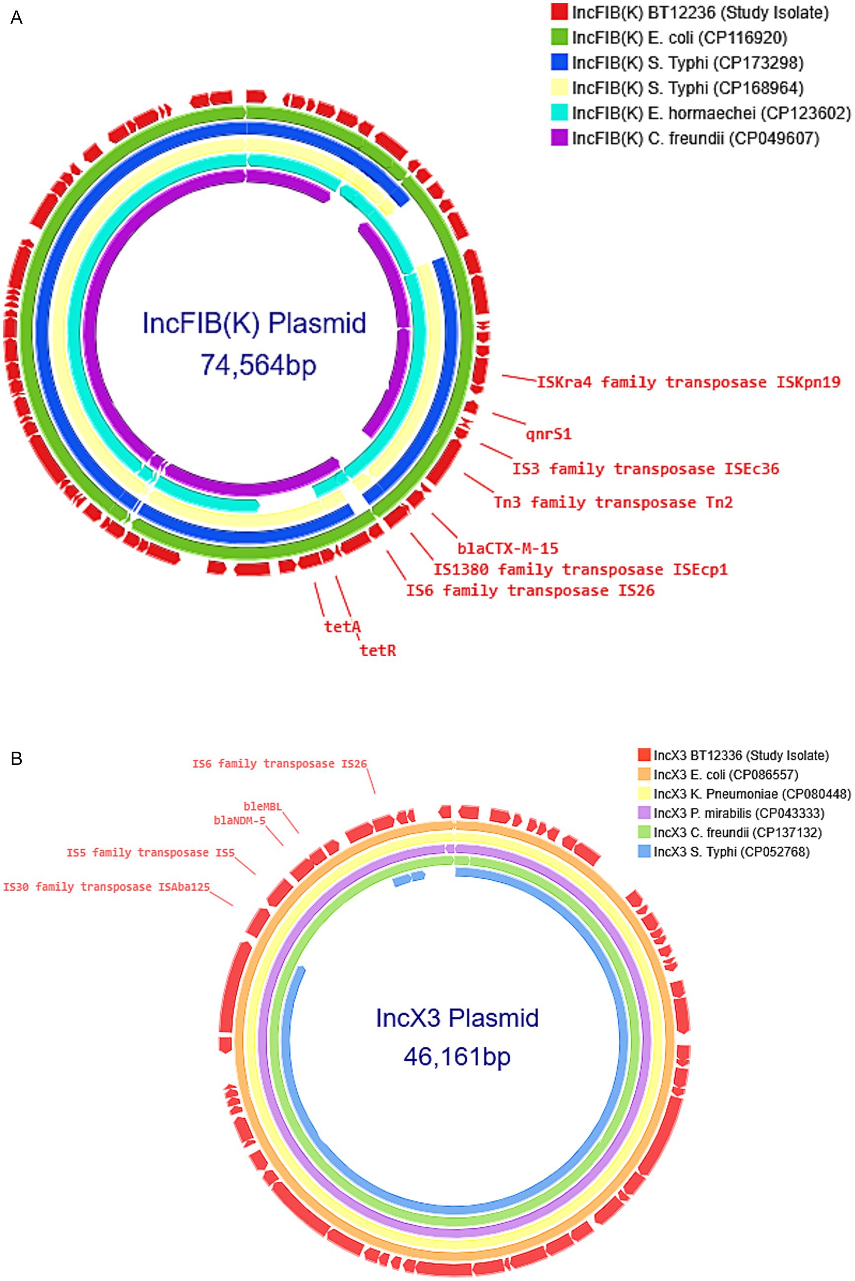 Figure 2. (A) Comparison of IncFIB(K) plasmid: The IncFIB(K) plasmid from the carbapenem-resistant Salmonella Typhi (CRST) isolate was BLAST-searched against the NCBI BLASTn database and compared with Enterobacteriales carrying plasmids of the same incompatibility group [(CP116920), (CP173298), (CP168964), (CP123602), (CP049607)] with 90–100% identity. The selected plasmids were then annotated and visualized using Proksee. (B) Comparison of IncX3 plasmid: The IncX3 plasmid from the carbapenem-resistant Salmonella Typhi (CRST) isolate was BLAST-searched against the NCBI BLASTn database and compared with Enterobacteriales carrying plasmids of the same incompatibility group [(CP086557), (CP080448), (CP043333), (CP137132), (CP052768)] with 90–100% identity. The selected plasmids were then annotated and visualized using Proksee.
