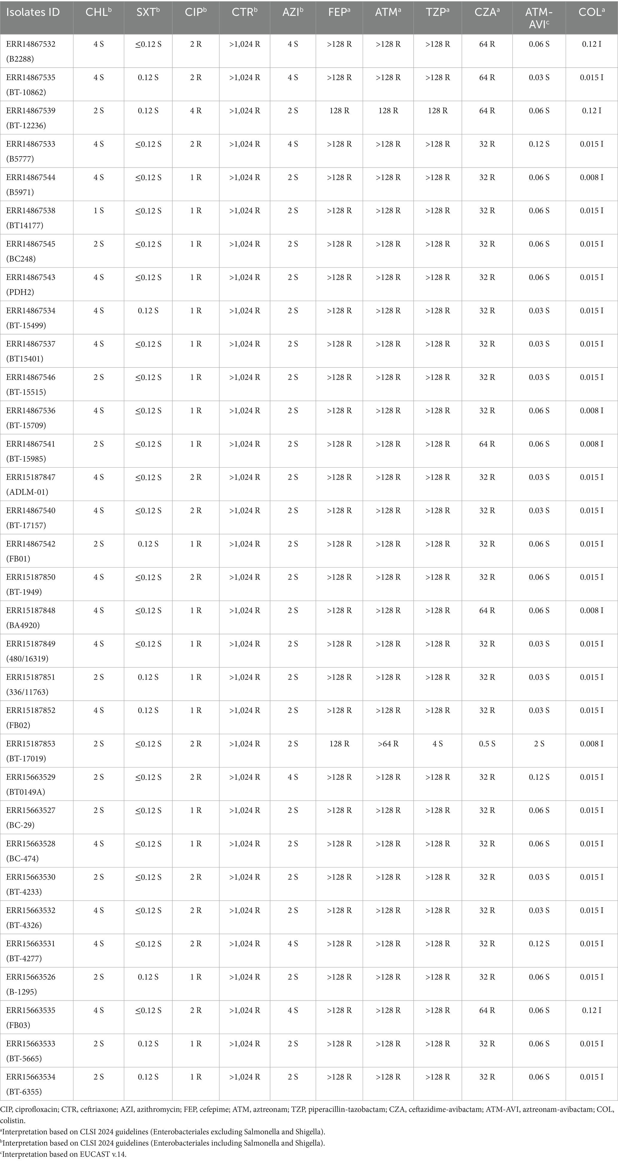 The isolates, once received at CMC Vellore, was cultured on blood and MacConkey agar plates to ensure purity. The isolates were confirmed S. Typhi by conventional biochemical tests, serotyping (Kauffmann–White scheme), and qPCR (Nair et al., 2019). Antimicrobial susceptibility (AST) of the study isolates were evaluated by Kirby–Bauer disk diffusion technique, with inhibition zone measurements and interpretations adhering to the Clinical and Laboratory Standards Institute criteria (Clinical and Laboratory Standards Institute, 2024). The tested antibiotics included ampicillin (10 μg), chloramphenicol (30 μg), trimethoprim/sulfamethoxazole (1.25/23.75 μg), ciprofloxacin (5 μg), pefloxacin (5 μg), ceftriaxone (30 μg), cefixime (5 μg), azithromycin (15 μg), meropenem (10 μg), and ertapenem (10 μg). To complement these findings, the broth microdilution (BMD) method was employed to assess the minimum inhibitory concentrations (MICs) of additional antibiotics, namely cefepime, aztreonam, piperacillin-tazobactam (fixed 4 μg/mL), ceftazidime-avibactam (fixed 4 μg/mL), aztreonam-avibactam (fixed 4 μg/mL), and colistin. Colistin MIC was interpreted according to EUCAST guidelines (The European Committee on Antimicrobial Susceptibility Testing, 2024).