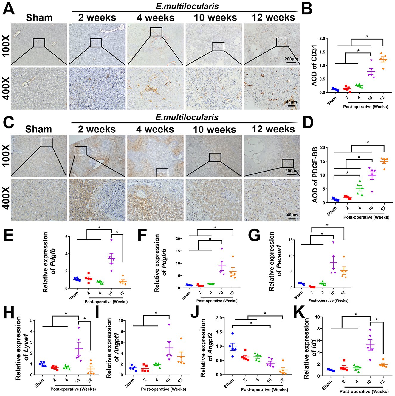 Figure 1. Increased hepatic angiogenesis in E. multilocularis infected mice. (A, B) Immunohistochemical staining of CD31. (C, D) Immunohistochemical staining of PDGF-BB. Quantitative real-time PCR detection of Pdgfb. (E, F) Quantitative real-time PCR detection of Pdgfb and Pdgfrb. (G–K) Quantitative real-time PCR detection of Pecam1, Lyve1, Angpt1, Angpt2, and Id1 genes expression. All data are presented as mean ± SEM. *P < 0.05, n = 5.