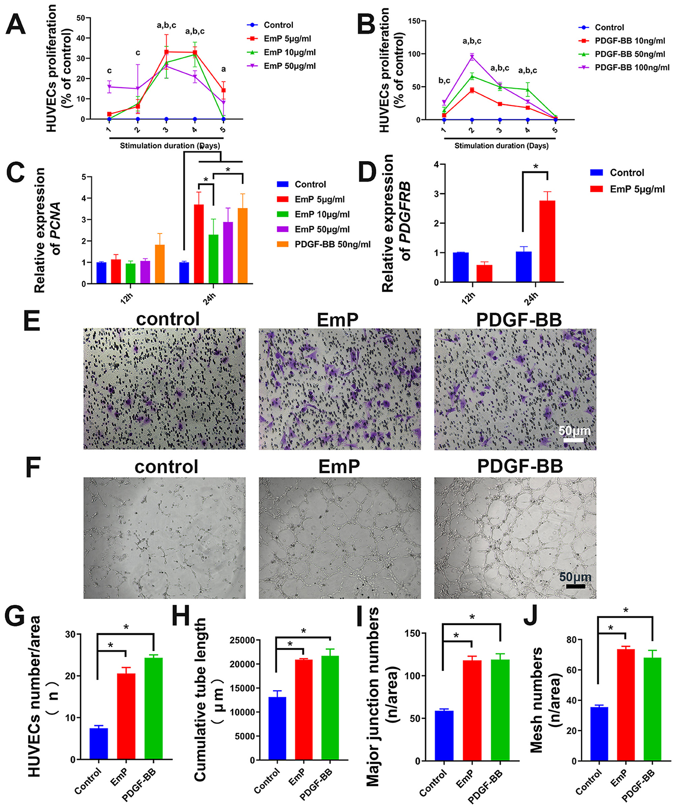 Figure 2. EmP significantly enhances the pseudocapillary formation ability of HUVECs in vitro. (A) Effect of EmP on the proliferation of HUVECs detected by CCK8 assay. aP < 0.05, Emp 5 ug/ml compared with Control, bP < 0.05, Emp 10 ug/ml compared with Control, cP < 0.05, Emp 15 ug/ml compared with Control. (B) Effect of PDGF-BB on the proliferation of HUVECs detected by CCK8 assay. aP < 0.05, PDGF-BB 10 ng/ml compared with Control, bP < 0.05, PDGF-BB 50 ng/ml compared with Control, cP < 0.05, PDGF-BB 100 ng/ml compared with Control. (C) Quantitative real-time PCR detection of PCNA after EmP and PDGF-BB stimulation. (D) Quantitative real-time PCR detection of PDGFRB after 679 EmP stimulation. (E) Representative images of transwell migration assay. (F) Representative images of pseudocapillary formation assay. (G) HUVECs counting results of transwell migration assay. (H) Counting results of the cumulative pseudocapillary length in HUVECs cells. (I) Counting results of the major junction numbers in HUVECs cells. (J) Counting results of the mesh numbers in HUVECs cells. Experiments were repeated three times and all data are presented as mean ± SEM. *P < 0.05. n = counts.