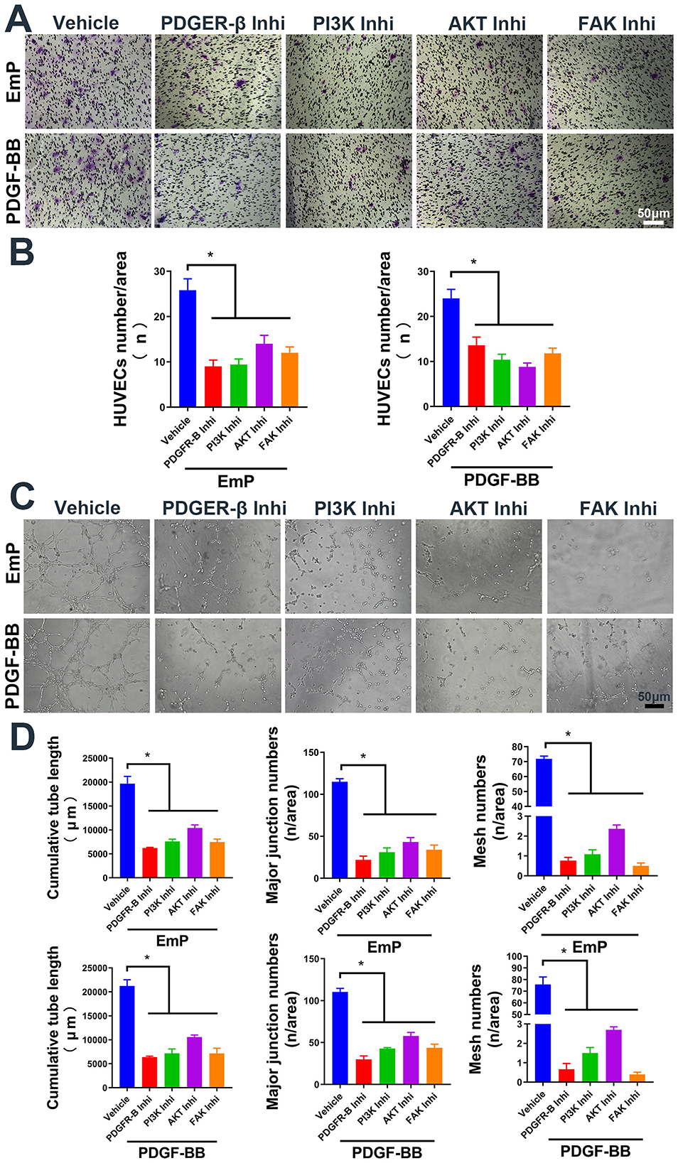 Figure 3. EmP promote HUVECs migration and pseudocapillary formation through PDGFR/PI3K/AKT/FAK pathway. (A) Representative images of transwell migration assay in HUVECs with inhibitor intervention. (B) HUVECs counting results of transwell migration assay with inhibitor intervention. (C) Representative images of pseudocapillary formation assay in HUVECs with inhibitor intervention. (D) Counting results of the cumulative pseudocapillary length, major junction numbers and mesh numbers in HUVECs with inhibitor intervention and co-treatment with EmP or PDGF-BB. Experiments were repeated three times and all data are presented as mean ± SEM. *P < 0.05. Inhi, inhibitor.