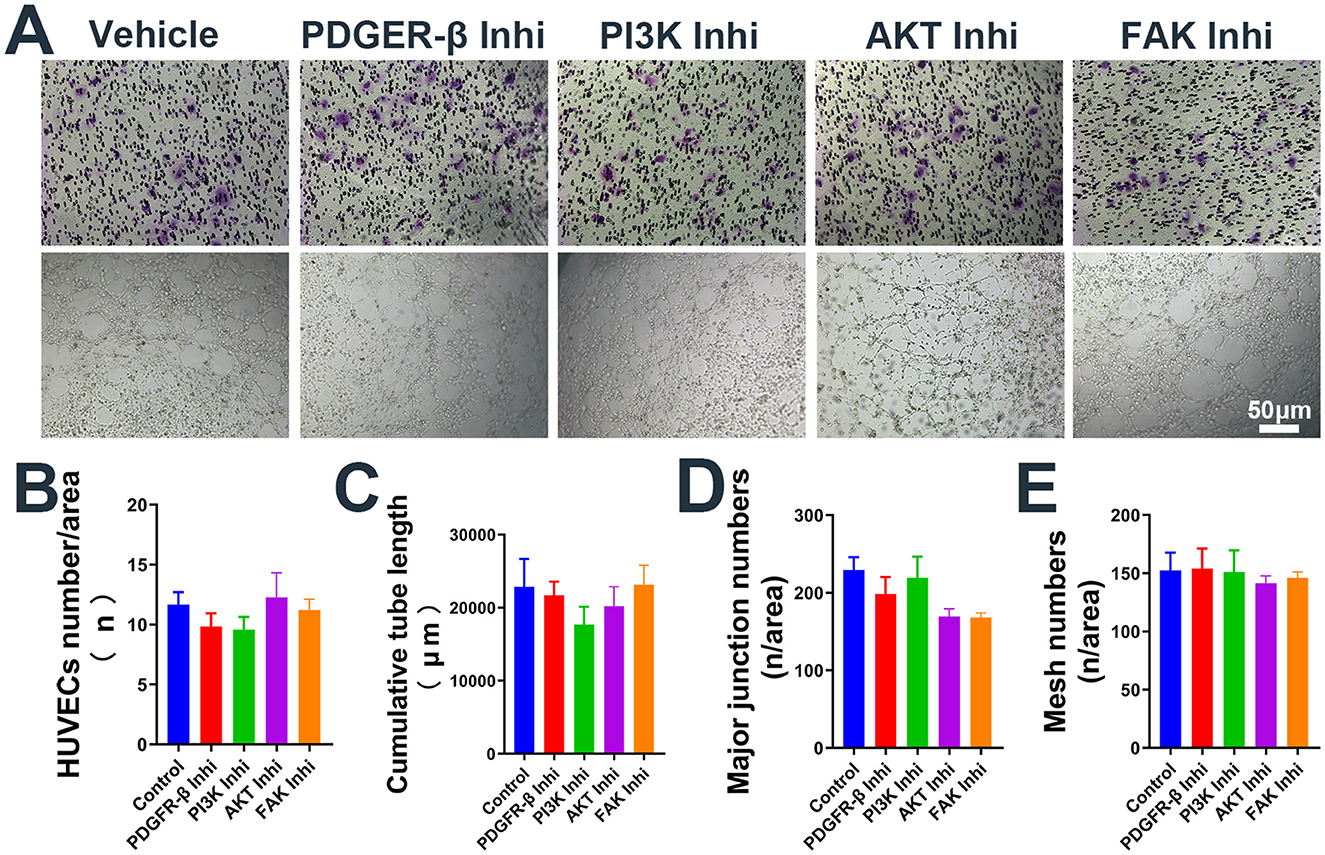 Figure 4. Administration of inhibitors alone the use of inhibitors alone does not affect the migration and pseudocapillary formation of HUVECs. (A) Representative images of transwell migration assay (Top) and pseudocapillary formation assay (Bottom) in HUVECs with inhibitor alone. (B) HUVECs counting results of transwell migration assay with inhibitor alone. (C) Counting results of the cumulative pseudocapillary length in HUVECs with inhibitor alone. (D) Counting results of the major junction numbers in HUVECs with inhibitor alone. (E) Counting results of the mesh numbers in HUVECs with inhibitor alone. Experiments were repeated three times and all data are presented as mean ± SEM. Inhi, inhibitor. n = counts.
