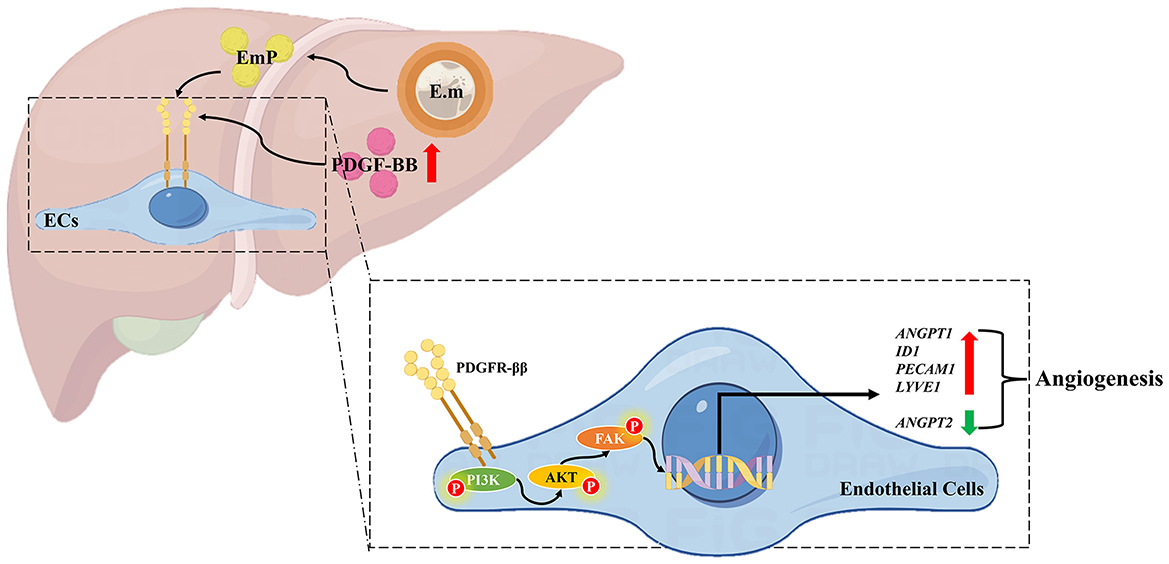 Figure 5. Schematic diagram of pro-angiogenesis mechanism in Echinococcus multilocularis infection. On the one hand, Echinococcus multilocularis infection directly upregulates PDGF-BB expression in the host liver, thereby stimulating angiogenesis through the activation of the PDGFR/PI3K/AKT/FAK signaling pathway. On the other hand, the secretion of EmP also contributes to angiogenesis by acting on the PDGFR/PI3K/AKT/FAK signaling pathway. The pathological angiogenesis in the peri-lesion area provides nutrients for the growth and development of the parasite, thus facilitating parasitism. E.m, E. multilocularis infection; EmP, E. multilocularis protoscoleces protein.