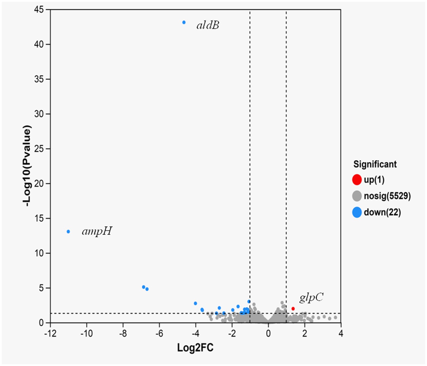 Figure 1. Volcano plot of expression difference for aldB knockout strain VS wild-type strain. The abscissa represents the fold change value of gene expression difference between the two groups of samples, i.e., the FC value. The ordinate represents the statistical test value of the difference in gene expression changes, i.e., the p-value. A higher p-value indicates a more significant expression difference, and both the abscissa and ordinate values have undergone logarithmic processing. Each point in the figure represents a specific gene: red points indicate significantly up-regulated genes, green points indicate significantly down-regulated genes, and gray points indicate genes with non-significant differences. After mapping all genes, it can be seen that the points on the left represent genes with down-regulated expression differences, and the points on the right represent genes with up-regulated expression differences. The points closer to the two sides and the top have more significant expression differences.