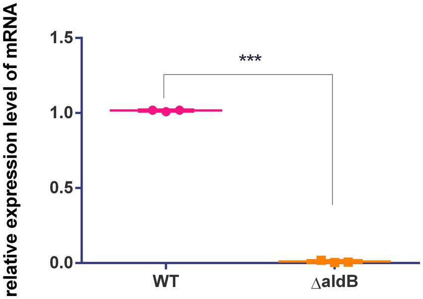 To demonstrate that acoR regulates aldB expression, qPCR was used to measure aldB mRNA levels in the wild-type and acoR knockout strains. The E value of aldB is 101.5%, which falls within the ideal range (90–110%) for qPCR primer efficiency (Supplementary Figure S7). The melting curve of aldB shows a single peak, indicating that the primer for aldB has good specificity (Supplementary Figure S4). Compared with wild-type P. diazotrophicus, aldB mRNA levels in the acoR knockout strain were significantly reduced (Figure 3). This indicates that acoR upregulated aldB expression and reduced P. diazotrophicus resistance to these antibiotics.