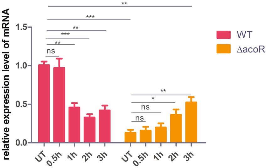 Figure 3. Comparison of relative aldB expression levels in wild-type and acoR knockout strains of P. diazotrophicus following simultaneous stimulation with 2 × MIC ceftazidime for 0.5 h, 1 h, 2 h, and 3 h. WT represents the wild-type strain, △acoR represents the acoR knockout strain, and UT indicates no treatment. Data represent the mean ± standard deviation of five sample results. * indicates p < 0.05; ** indicates p < 0.01; *** indicates p < 0.001; ns indicates no statistically significant difference.