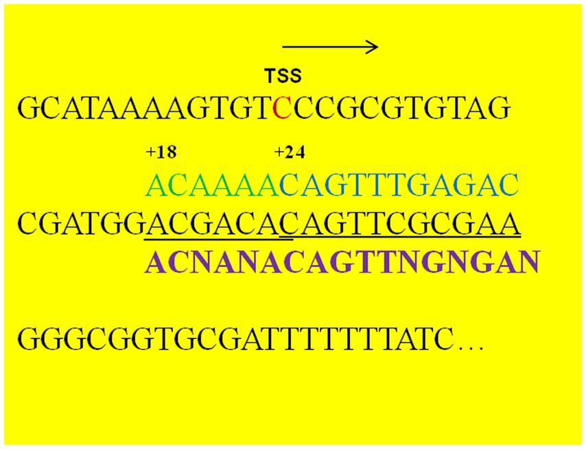 Figure 4. Nucleotide sequence downstream of the aldB transcription start site. TSS refers to the transcription start site identified by transcriptomic analysis. Arrows indicate the direction of transcription. The nucleotide sequences in black font (including the TSS) represent the upstream sequence of the translation initiation codon of P. diazotrophicus aldB, the nucleotide sequences in green and blue fonts represent the reported binding sequences of the AcoR protein from other bacterial species, the underlined part indicates the potential binding region of AcoR protein in P. diazotrophicus, and the sequences in purple font represent the binding motifs of the AcoR protein.