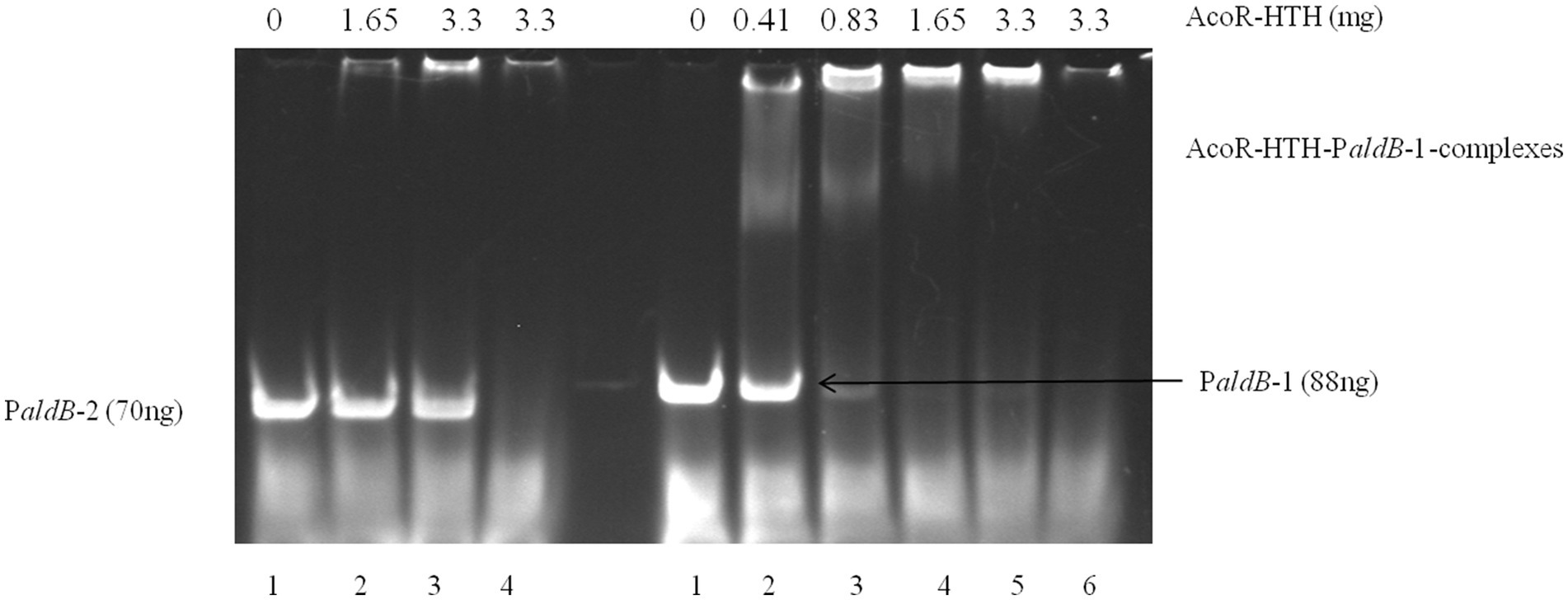 Figure 5. EMSA of AcoR-HTH protein with the aldB promoter region. In the left panel of the figure, only probe PaldB-2 was added to Lane 1 with no AcoR protein included. Different concentrations of AcoR protein were added to probe PaldB-2 in Lanes 2–3. The highest amount of AcoR protein was added to Lane 4, while no probe PaldB-2 was included. In the right panel of the figure, only probe PaldB-1 was added to Lane 1 with no AcoR protein included. Different concentrations of AcoR protein were added to probe PaldB-1 in Lanes 2–5. The highest amount of AcoR protein was added to Lane 6, while no probe PaldB-1 was included.