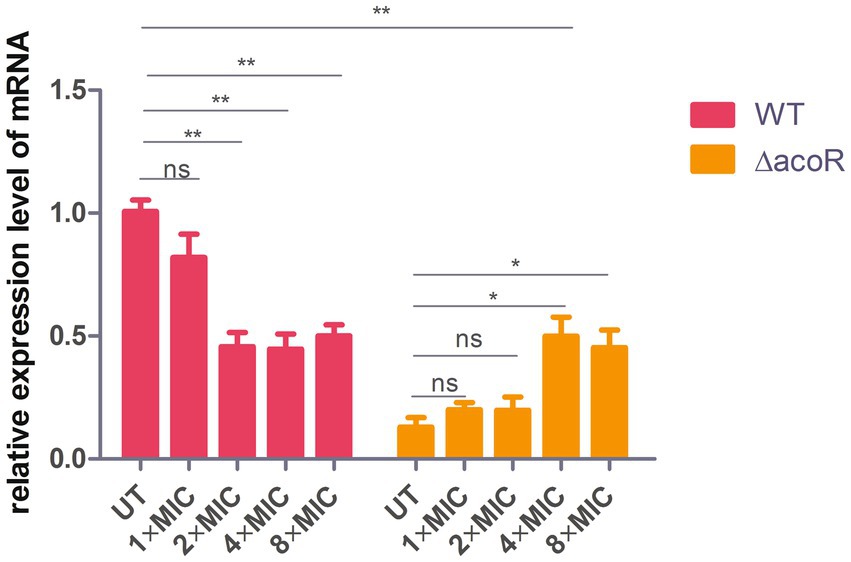 Figure 6. Comparison of relative aldB expression levels in wild-type and acoR knockout strains of P. diazotrophicus following simultaneous stimulation with ceftazidime at different MIC concentrations for 1 h. WT represents the wild-type strain, △acoR represents the acoR knockout strain, and UT indicates no treatment. Data represent the mean ± standard deviation of five sample results. * indicates p < 0.05; ** indicates p < 0.01; ns indicates no statistically significant difference.