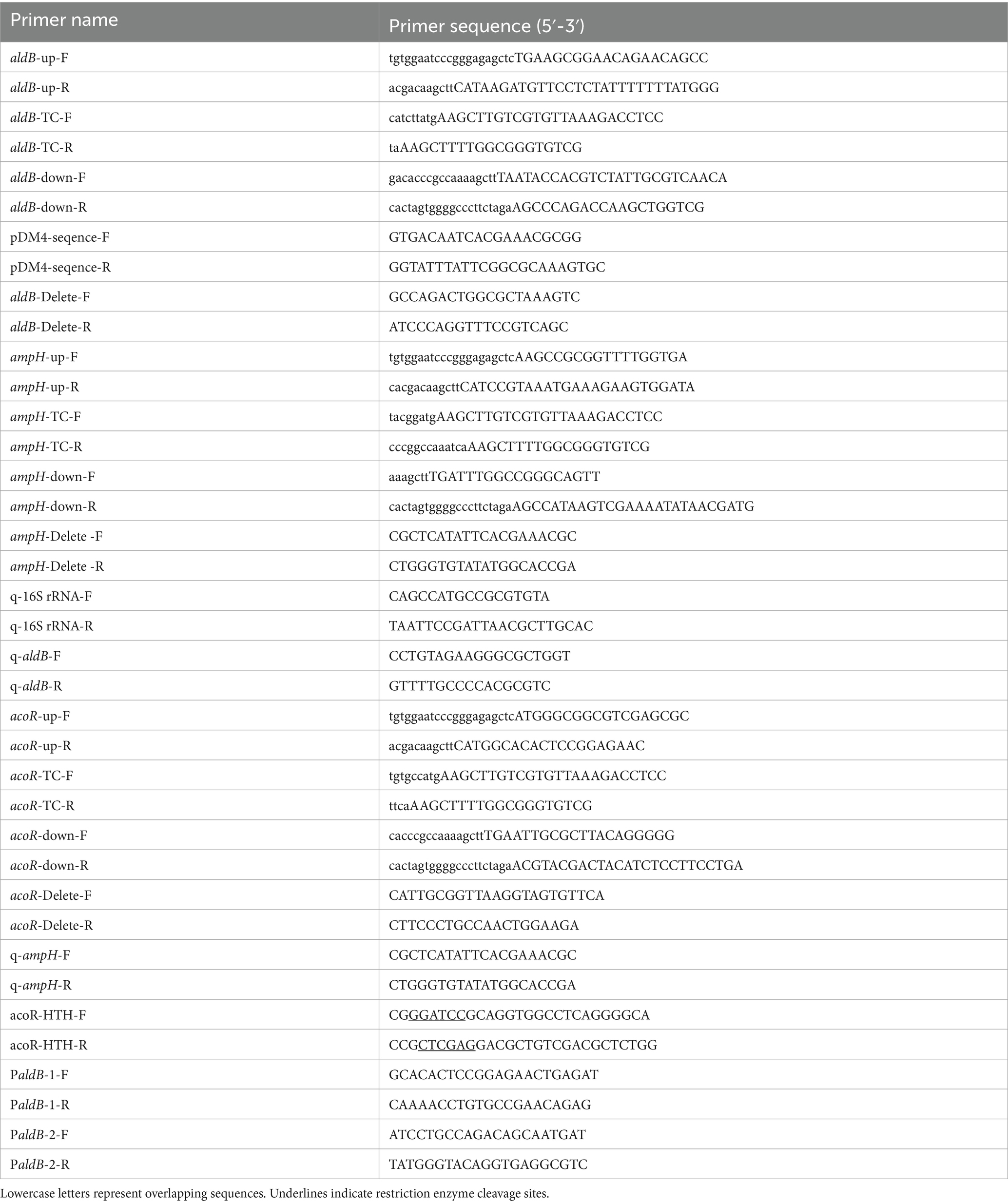 The construction of the acoR gene knockout strain also followed the method used for the aldB knockout strain. Amplification of the upstream homologous arm, downstream homologous arm, and tetracycline resistance gene cassette was accomplished using high-fidelity PCR with the primer pairs acoR-up-F/acoR-up-R, acoR-down-F/acoR-down-R, and acoR-TC-F/acoR-TC-R, respectively. The knockout efficiency of the acoR gene was confirmed by PCR verification using the primer pair acoR-Delete-F/acoR-Delete-R. The sequences of all related primers are detailed in Table 1.