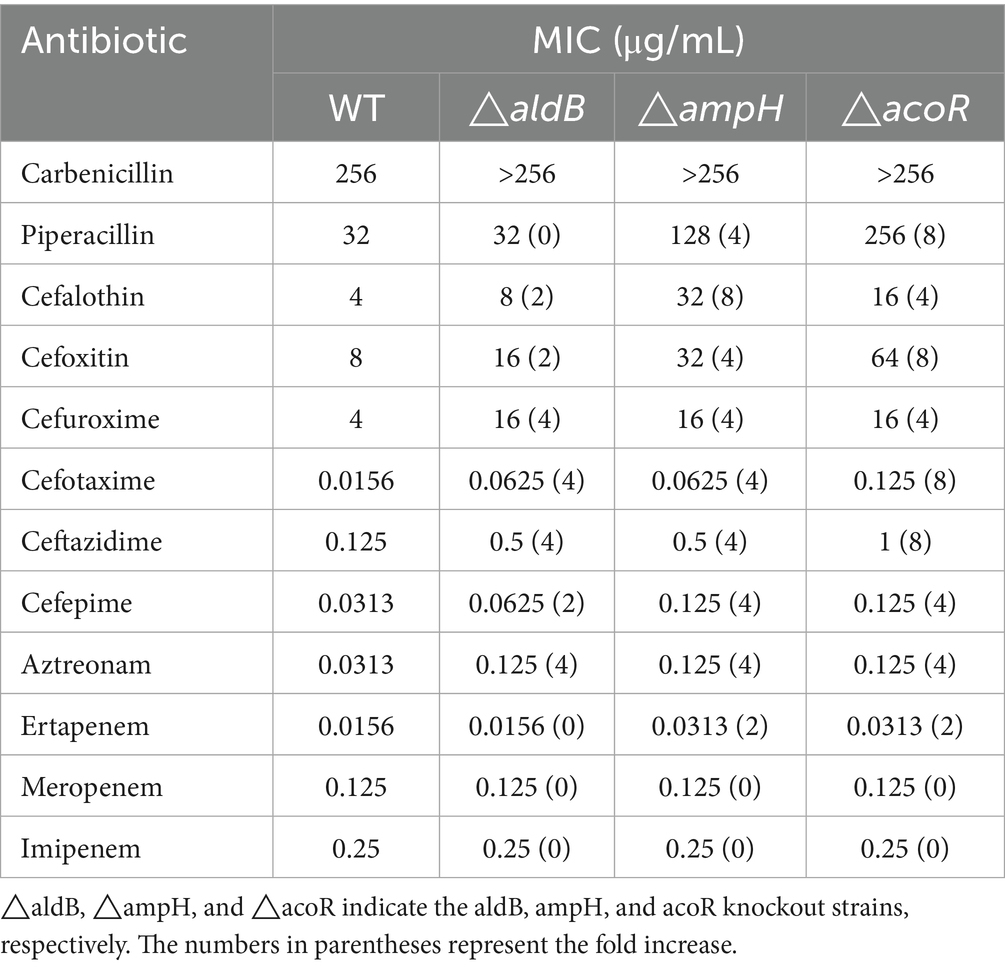 The minimum inhibitory concentration (MIC) values of the strains against 12 β-lactam antibiotics, including carbenicillin, piperacillin, cefalotin, cefoxitin, cefuroxime, cefotaxime, ceftazidime, cefepime, aztreonam, ertapenem, meropenem, and imipenem, were determined using the MH agar plate dilution method. The specific procedure was as follows: first, the strains were revived on blood plates for 24 h, and single colonies were picked and subcultured for 24 h. Subsequently, each antibiotic with a serial dilution concentration was added to empty plates, and then 25 mL of MH agar medium at approximately 50 °C was poured into each plate. Before conducting the experiment, mark the regions for the wild-type strain and the knockout mutant strain on the bottom of each MH agar plate. Next, the concentration of the bacterial suspension was adjusted to the 0.5 McFarland turbidity standard using a McFarland turbidimeter with sterile 0.65% physiological saline, and 1 μL of the bacterial suspension was titrated onto the surface of the MH agar plates. After air-drying, the plates were placed in an incubator at 37 °C, and the MIC values of each strain were observed after 20 h. E. coli ATCC8739 was selected as the quality control bacterium. The MIC determination results of this reference strain fell within the range specified in the Clinical and Laboratory Standards Institute (CLSI) document M100-Ed35. This biological experiment was repeated three times.