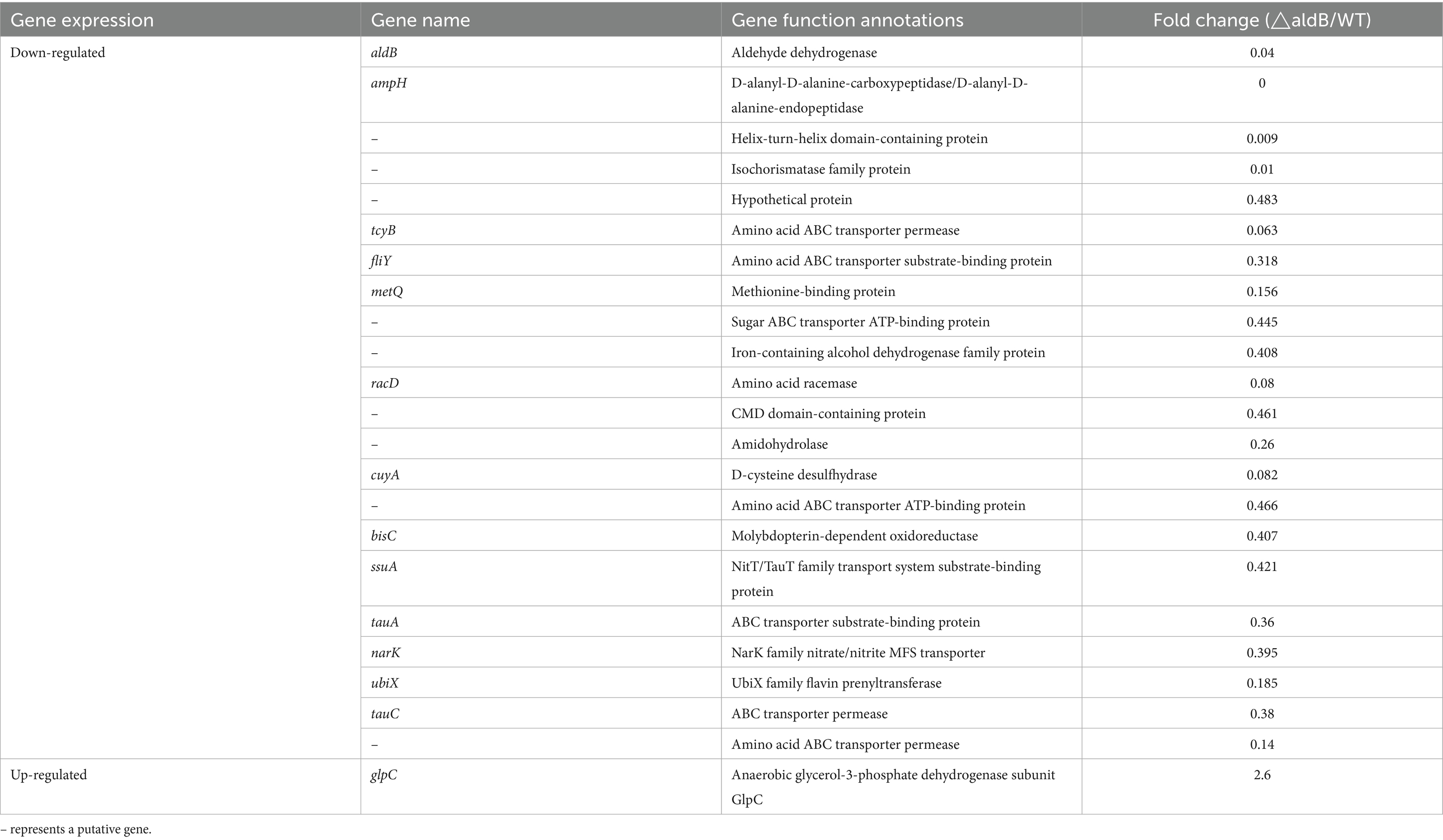 The intergenic region between aldehyde dehydrogenase B (aldB) and yiaW may contribute to the tolerance of Escherichia coli to antimicrobial agents rather than the aldB itself (Hu and Coates, 2005). However, aldB gene reduces the resistance of Lactobacillus reuteri (L. reuteri) to chloramphenicol but not to β-lactam antibiotics (Wang et al., 2024). This study did not assess why aldB reduced chloramphenicol resistance. The presence of aldB increases the number of persisters under non-stress conditions. However, the effect of aldB on persister counts is environmentally dependent. For example, under amino acid limitation, aldB knockdown unexpectedly increased persister numbers. Because this increase is associated with glycolytic metabolites, metabolic flux may play a crucial role in aldB-mediated persister formation (Kawai et al., 2018). Therefore, it can be concluded that the aldB regulates antibiotic resistance in certain bacteria (but not all) and is involved in persister formation.
