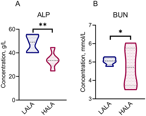 Figure 1. Differential serum physiological and biochemical indicators [ALP: (A); BUN: (B)] between LALA and HALA groups. The statistical significance of the different treatments was assessed using Student's t-tests. *p < 0.05, **p < 0.01, ***p < 0.001. The absence of * indicated that the difference was not statistically significant.