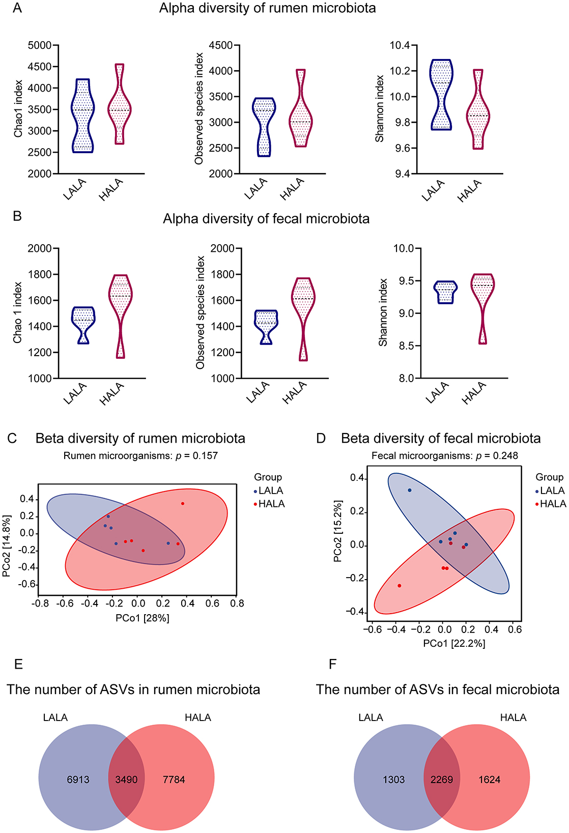 Figure 2. (A, B) Alpha diversity and richness of rumen and fecal microorganisms in the LALA and HALA groups. The alpha diversity indices evaluated included the Chao1 index, Observed species index, and Shannon index. (C, D) PCoA plots based on the Bray-Curtis distance matrix at the ASV level for rumen and fecal microorganisms, respectively. PERMANOVA results with 999 permutations were provided (rumen microorganisms: p = 0.157; fecal microorganisms: p = 0.248). The horizontal and vertical axes represented PCo1 and PCo2, respectively, indicating the proportion of variability they explain. (E, F) The number of shared and unique ASVs in the rumen microbial community and fecal microbial community. LALA, low proportion of ALA; HALA, high proportion of ALA. *p < 0.05, **p < 0.01, ***p < 0.001. The absence of * indicated that the difference was not statistically significant.