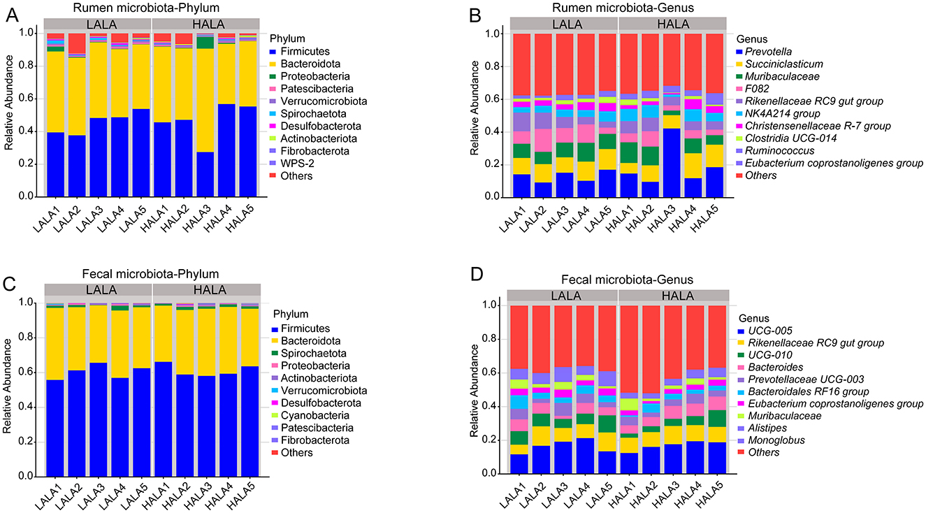 To investigate the microbial composition of rumen and fecal microorganisms in LALA group and HALA group, the taxonomic composition of species was analyzed. Figure 3A showed that the dominant bacteria in the rumen of the two groups were Firmicutes (LALA: 45.66% ± 6.79%, HALA: 46.53% ± 11.70%) and Bacteroidota (LALA: 44.85% ± 4.18%, HALA: 46.01% ± 10.26%). Figure 3B showed that the top five relative abundances of rumen microbiota in the LALA group were Prevotella (13.26% ± 3.32%), Succiniclasticum (10.96% ± 1.30%), Muribaculaceae (9.19% ± 1.45%), F082 (9.09% ± 3.85%) and Rikenellaceae RC9 gut group (7.28% ± 3.37%). In the HALA group, the top five relative abundances rumen microbiota were Prevotella (19.46% ± 13.17%), Succiniclasticum (10.71% ± 3.71%), Muribaculaceae (8.35% ± 4.05%), Rikenellaceae RC9 gut group (6.26% ± 1.53%), NK4A214 group (5.84% ± 2.63%). Similarly, Firmicutes (LALA: 60.47% ± 4.05%, HALA: 61.25% ± 3.52%) and Bacteroidota (LALA: 36.92% ± 3.25%, HALA: 35.94% ± 3.00%) were the dominant bacteria in the feces of both groups (Figure 3C). Figure 3D showed that the top five relative abundances fecal microbiota genera in the LALA group were UCG-005 (16.49% ± 3.97%), Rikenellaceae RC9 gut group (8.98% ± 2.43%), UCG-010 (7.49% ± 1.83%), Bacteroides (5.26% ± 2.13%), and Prevotellaceae UCG-003 (4.98% ± 2.20%). In the HALA group, the top five relative abundances fecal microbiota genera were UCG-005 (16.91% ± 2.79%), Rikenellaceae RC9 gut group (9.48% ± 0.81%), Bacteroides (6.70% ± 1.42%), UCG-010 (5.12% ± 2.92%), and Prevotellaceae UCG-003 (4.19% ± 1.24%).