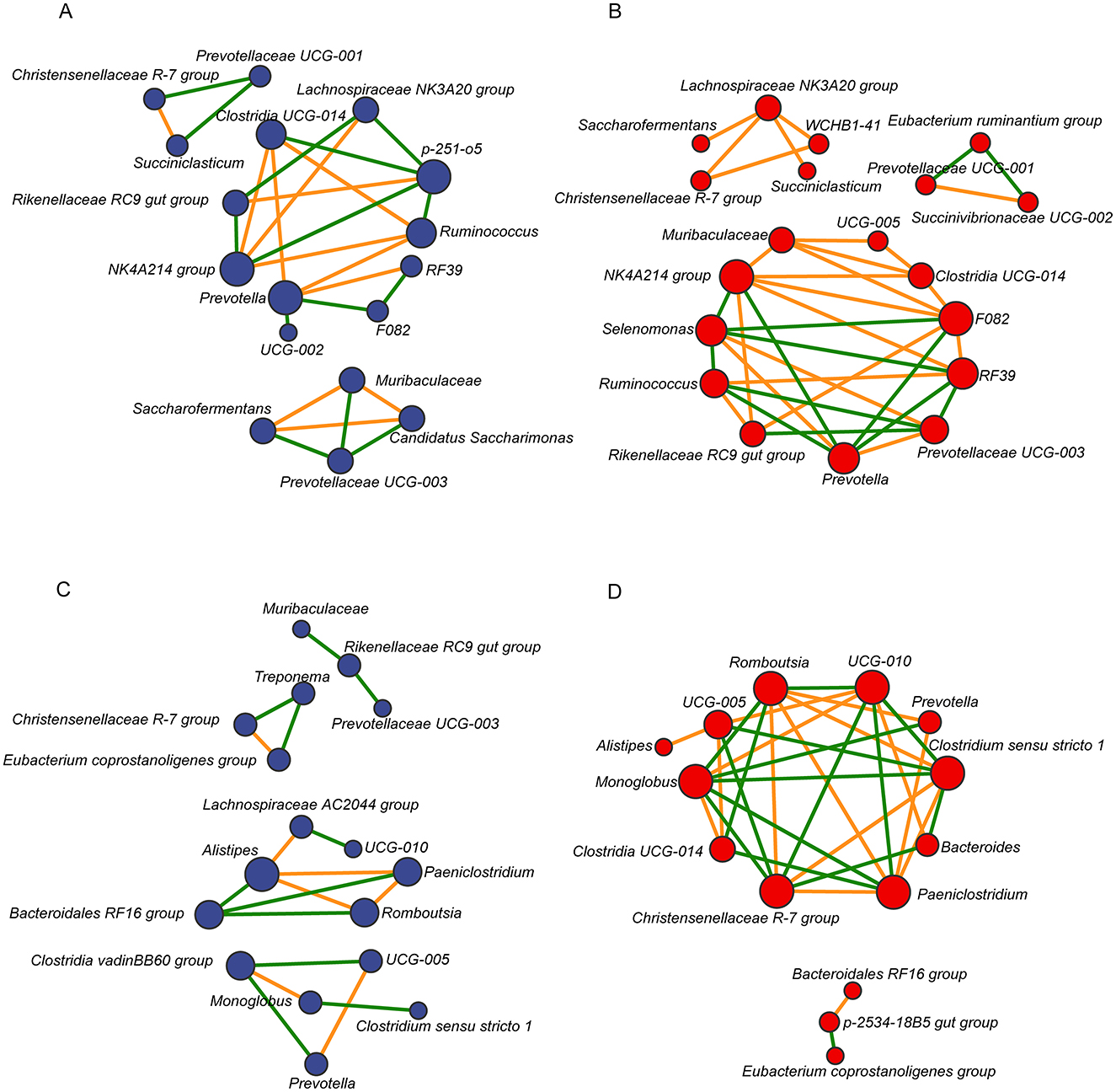 Figure 4. Spearman correlation networks of the top 20 most relatively abundant bacterial taxa in the rumen [LALA: (A); HALA: (B)] and fecal [LALA: (C); HALA: (D)] microbial communities. The blue nodes indicated genera in the LALA group and the red nodes indicated genera in the HALA group. The color edges stood for strong (Spearman's correlation coefficient < −0.6 or > 0.6) and significant (p < 0.05) correlations between genera, including positive correlations (orange) and negative correlations (green). LALA, low proportion of ALA; HALA, high proportion of ALA.