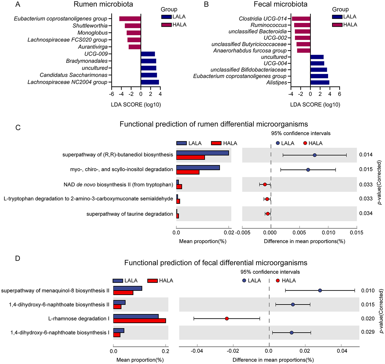 Figure 5. (A, B) The rumen differential microbiota and fecal differential microbiota based on LEfSe analysis in LALA and HALA groups. Significant differences were identified based on |LDA| > 2 with p < 0.05. (C, D) The functional differences of rumen microorganisms and fecal microorganisms in dairy cows from the LALA and HALA groups. PICRUSt software was used to predict the functional profiles of rumen and fecal bacteria in the LALA and HALA groups based on the MetaCyc database and then STAMP software was employed to analyze the functional differences between the two groups. LALA, low proportion of ALA; HALA, high proportion of ALA.