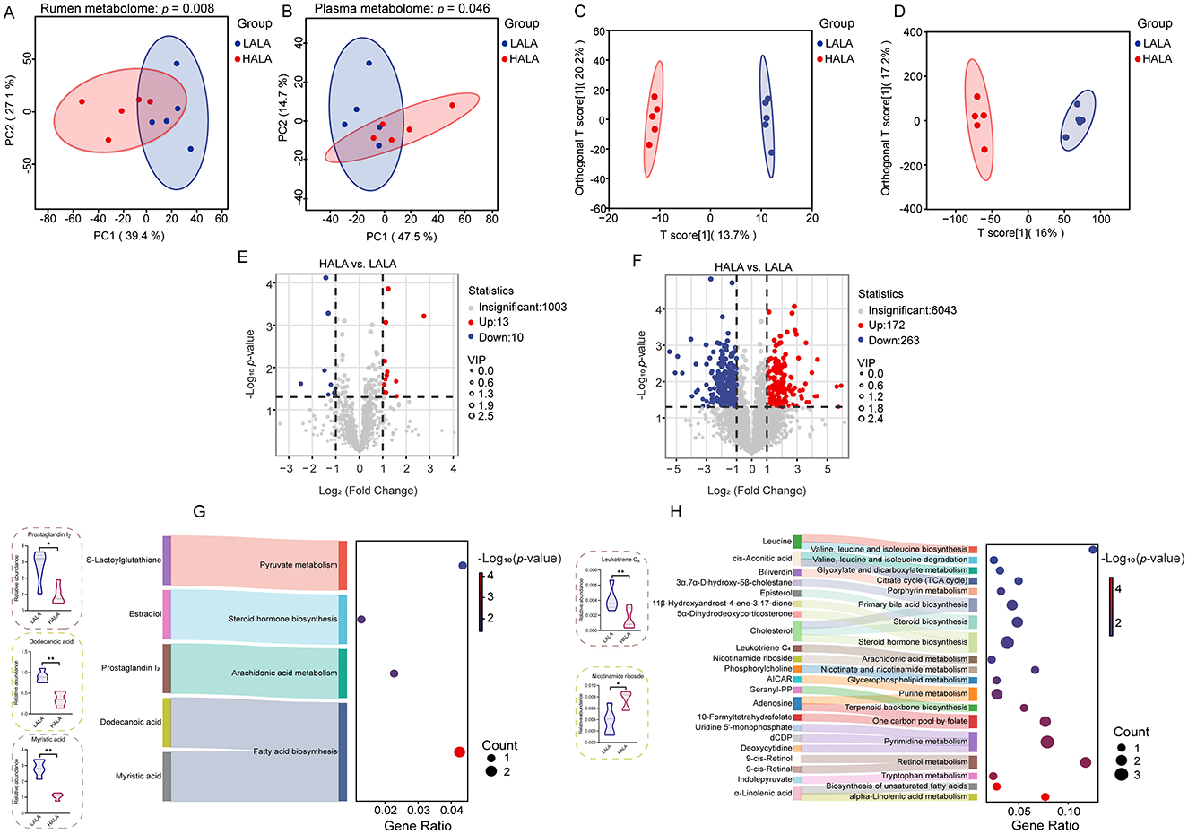 Figure 6. (A, B) PCA plots for the rumen metabolome and plasma metabolome, along with PERMANOVA results based on 999 permutations (rumen metabolome: p = 0.008; plasma metabolome: p = 0.046). The horizontal and vertical axes represented PC1 and PC2, respectively, indicating the proportion of variability they explained. (C, D) OPLS-DA models of the rumen metabolome and plasma metabolome. In these plots, the horizontal axis represented the T score of the first predictive principal component, while the vertical axis represented the Orthogonal T score. (E, F) The differential metabolites identified in the rumen and plasma metabolomic profiles. Significant differences were identified based on VIP scores >1.0, p-values <0.05 from Student's t-tests, and fold change thresholds (|log2FC| >1). (G, H) The significantly enriched pathways of differential metabolites in the rumen and plasma, with the ratio representing the proportion of enriched metabolites relative to all metabolites in the pathway, and displayed the key differential metabolites concentrations in the rumen and plasma, respectively. Fisher's exact test was employed to evaluate pathway significance in the Bos taurus KEGG database. LALA, low proportion of ALA; HALA, high proportion of ALA. *p < 0.05, **p < 0.01, ***p < 0.001. The absence of * indicated that the difference was not statistically significant.