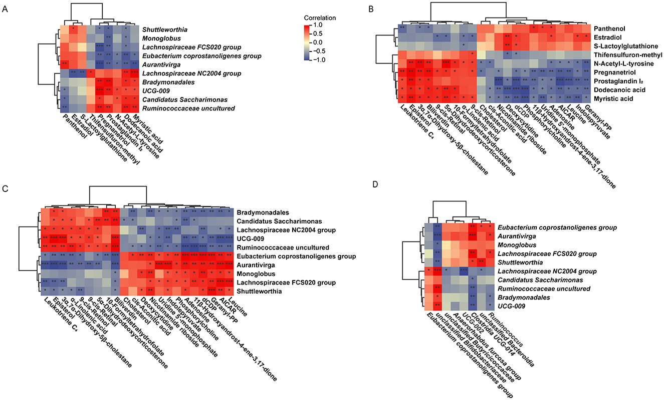 Figure 7. (A) Correlation analysis of rumen differential microbes and rumen differential metabolites. (B) Correlation analysis of rumen differential metabolites and plasma differential metabolites. (C) Correlation analysis of rumen differential microbes and plasma differential metabolites. (D) Correlation analysis of rumen differential microbes and fecal differential microbes. LALA, low proportion of ALA; HALA, high proportion of ALA. Spearman correlation analysis was performed, and correlations with |r| > 0.6 and p < 0.05 were considered statistically significant. *p < 0.05, **p < 0.01, ***p < 0.001. The absence of * indicated that the difference was not statistically significant.