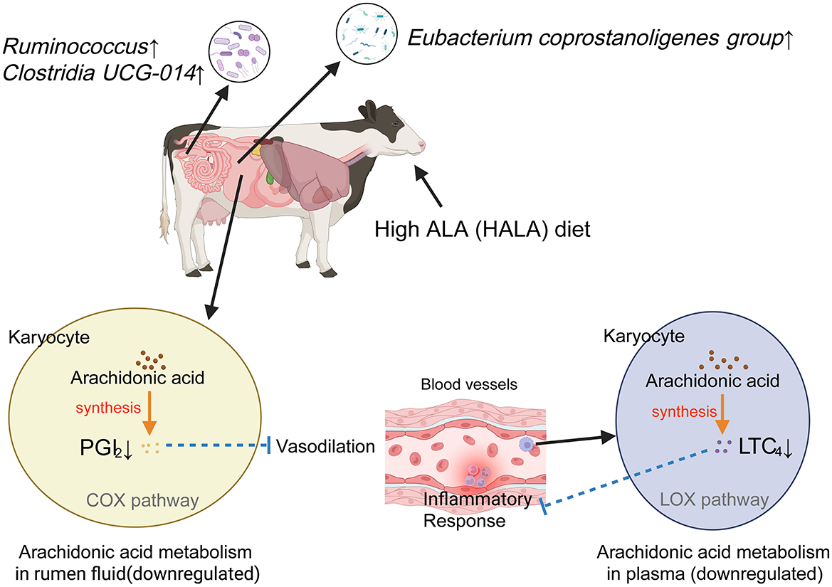 Results: The HALA group exhibited increased ruminal abundance of Eubacterium coprostanoligenes group and Ruminococcus (p < 0.05), alongside reduced proinflammatory metabolites including dodecanoic acid, myristic acid, and prostaglandin I2 in the rumen. Plasma leukotriene C4 levels were also decreased (p < 0.05). Metabolomic enrichment analysis revealed significant downregulation of arachidonic acid metabolism. Correlation analyses demonstrated that Eubacterium coprostanoligenes group negatively associated with suppressed prostaglandin I2 (rumen metabolite) and leukotriene C4 (plasma metabolite), but positively correlated with enriched fecal Clostridia UCG-014 and Ruminococcus.