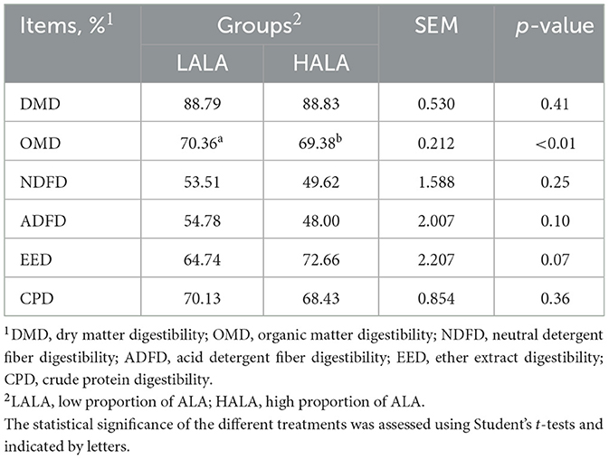 A completely randomized design was used in this study. Differences in ATTD of nutrients, serum biochemical indices and rumen fatty acid content were compared using the Student's t-tests of SAS 9.4 (SAS Institute Inc., Cary, NC, USA). Prior to conducting the Student's t-tests, all data were assessed for normality using the Shapiro-Wilk test and for homogeneity of variance using Levene's test. The results indicated that all assumptions underlying the Student's t-tests were satisfied. The model was presented as follows: