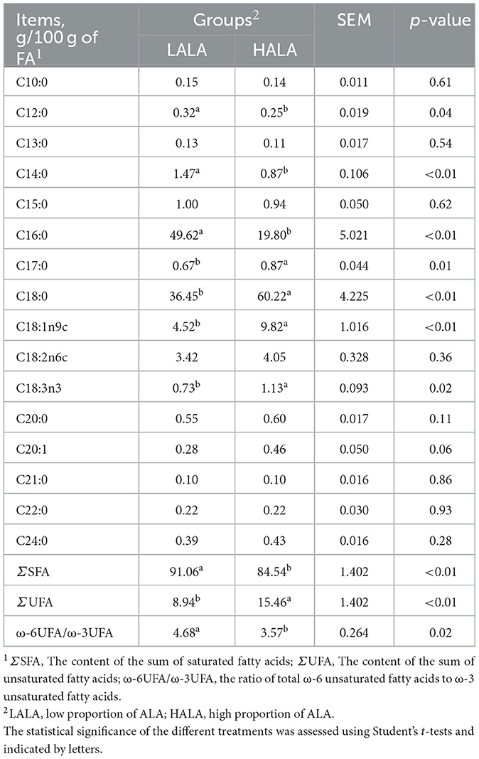 On Day 21, rumen fluid samples were collected before morning feeding using a transoral stomach tube. The initial 50 mL of collected fluid was discarded to minimize contamination from saliva. The collected samples were preserved as a heterogeneous solid-liquid mixture containing feed particles and microbial components, without undergoing filtration or centrifugation. This approach was designed to rapidly capture the initial and most sensitive alterations in fatty acid profiles within the rumen contents—following dietary supplementation with ALA, by direct analysis of the whole mixture. The remaining rumen fluid was immediately transferred into four 2-mL cryovials and stored at −80 °C for subsequent fatty acid analysis. To analyse fatty acid concentration in rumen fluid, a 100 μL aliquot of rumen fluid was transferred to a 15 mL screw-cap glass tube. Subsequently, 4 mL of acetyl chloride–methanol reagent (1:10, v/v), 1 mL of C11:0 internal standard solution (1 mg/mL), and 1 mL of n-hexane were added sequentially. The tube was tightly capped and vortexed thoroughly to ensure homogenization. Methylation of fatty acids was carried out by incubating the mixture at 80 °C in a water bath for 2 hours. Following the reaction, the tube was cooled to room temperature, after which 5 mL of 7% (w/v) potassium carbonate solution was added to neutralize excess acid. The mixture was vortexed again and centrifuged at 1,200 r/min for 5 min. The upper organic layer was collected and filtered through a 0.2 μm microporous membrane filter, and the filtrate was transferred to a sample vial for analysis. Fatty acid methyl esters (FAMEs) were analyzed using an Agilent 6890 gas chromatograph (Agilent, USA) equipped with a flame ionization detector (FID). Chromatographic separation was achieved on a DB-23 capillary column (60.0 m × 250 μm × 0.25 μm, Agilent J&W, USA). The injector and FID temperatures were set at 260 °C and 270 °C, respectively. High-purity helium was used as the carrier gas at a constant flow rate of 2.0 mL/min. A 1 μL sample was injected in split mode with a split ratio of 30:1. The concentrations of individual fatty acids were quantified based on the ratio of their peak areas relative to that of the C11:0 internal standard. To bridge the alterations observed in the upper gastrointestinal tract with ultimate production outcomes, we have referenced our team's prior study conducted on the same animal model (Yang et al., 2024) in the Discussion section. That work systematically demonstrated the significant effects of the identical dietary intervention on milk fatty acid composition.