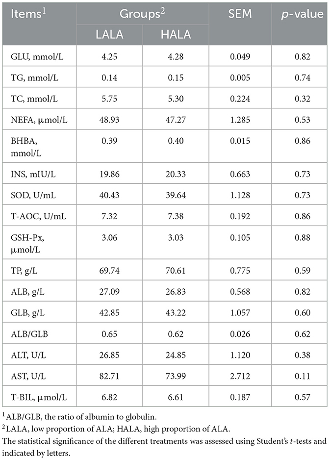Blood samples were collected from the tail root vein before morning feeding on the last day of the experiment. Whole blood was collected into both non-anticoagulant tubes and EDTA-anticoagulant tubes, with each tube containing approximately 10 mL of blood. Immediately after collection, the blood samples were centrifuged at 4,000 r/min for 15 min. The resulting supernatant was transferred into 2-mL cryovials and promptly stored at −80 °C for further analysis. Serum samples were analyzed using a Hitachi 7600 automatic biochemical analyzer (Hitachi Co., Ltd., Tokyo, Japan). Concentrations of glucose (GLU), total triglycerides (TG), total cholesterol (TC), blood urea nitrogen (BUN), superoxide dismutase (SOD), total antioxidant capacity (T-AOC), glutathione peroxidase (GSH-Px), total protein (TP), albumin (ALB), globulin (GLB), alanine aminotransferase (ALT), aspartate aminotransferase (AST), alkaline phosphatase (ALP), and total bilirubin (T-BIL) were detected. Insulin (INS) content was detected by radioimmunoassay using a Champion radioimmunoassay counter (BFM-96, Zhongcheng Electromechanical Technology Co., Ltd., Hefei, China). Non-esterified fatty acids (NEFA) and β-hydroxybutyric acid (BHBA) contents were measured using commercial ELISA kits according to the manufacturer's instructions (Nanjing Jiancheng Bioengineering Institute, Nanjing, China).