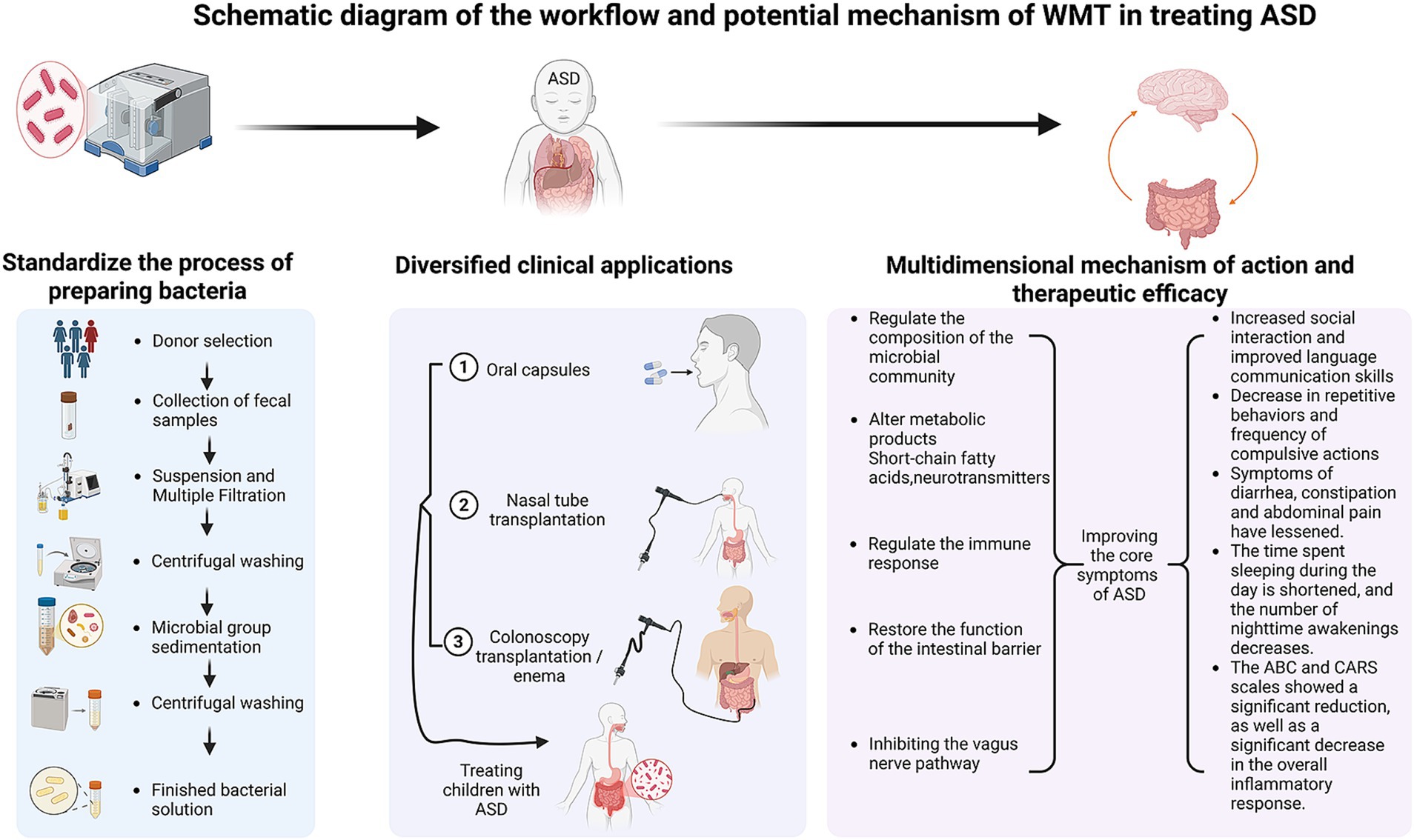 Autism Spectrum Disorder (ASD) arises from complex interactions between genetic and environmental factors, with gut microbiota dysbiosis emerging as a key environmental contributor. The human gut hosts 10–100 trillion microorganisms, including bacteria, viruses, protozoa, and fungi, collectively termed the gut microbiota. ASD patients exhibit gut dysbiosis characterized by pathogenic overgrowth and metabolic disturbances. Studies report that 9–91% of ASD patients experience gastrointestinal (GI) symptoms such as bloating, diarrhea, constipation, and foul-smelling stools (Moradi et al., 2021; Holingue et al., 2018), often accompanied by esophagitis, gastritis, or lymphocytic infiltration, with approximately half suffering from alternating diarrhea and constipation (Duan et al., 2015). Notably, alleviating GI symptoms correlates with reduced ASD severity (Chen and Chiu, 2022). Recent evidence underscores the role of gut microbiota in ASD pathogenesis, with interventions like probiotics and Fecal Microbiota Transplantation (FMT) showing therapeutic potential (Strati et al., 2017; Kang et al., 2017; Kang et al., 2019). Unlike probiotics, which deliver single bacterial strains, FMT introduces ~1,000 native gut bacterial species, almost full coverage of all strains has been achieved. However, Washed Microbiota Transplantation (WMT), an advanced FMT technique, enhances safety by removing undigested residues, fungi, parasite eggs, and pro-inflammatory metabolites, thereby significantly reducing the incidence of clinical adverse reaction events, while addressing ethical and aesthetic concerns associated with traditional FMT (Zhang et al., 2020; Shi, 2020).