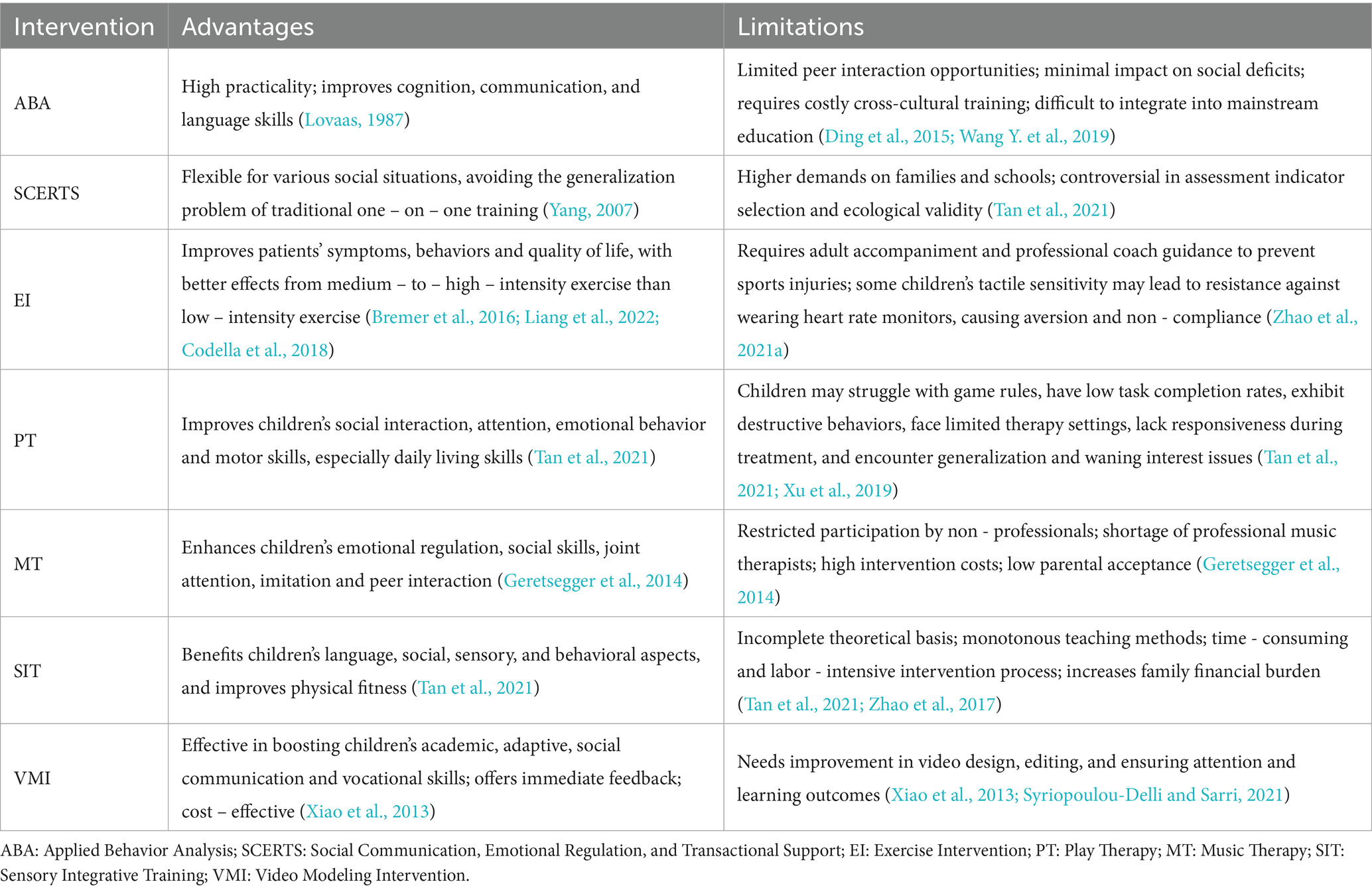 ABA: High practicality in improving cognition and language, but limited in social deficit improvement and high cross-cultural training costs (Lovaas, 1987; Ding et al., 2015; Wang Y. et al., 2019).