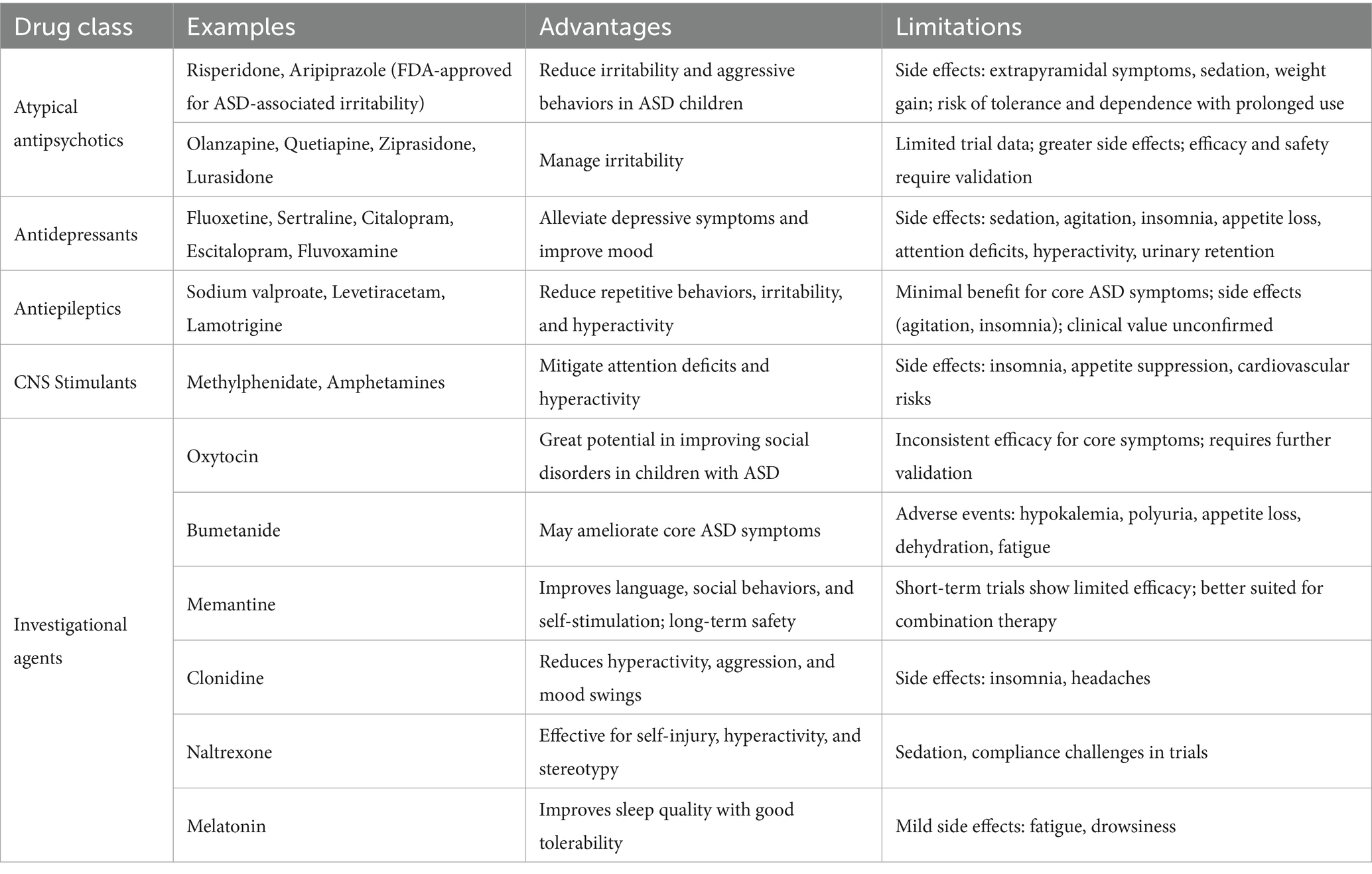 Drug treatment mainly targets comorbidiasis symptoms of ASD. For instance, risperidone and aripiprazole have been approved by the FDA for the treatment of irritability symptoms related to ASD (Stepanova et al., 2017; Shafiq and Pringsheim, 2018). However, there is currently no drug that can effectively improve the core symptoms of ASD, and long-term use may cause significant side effects, limiting their clinical application (Sharma et al., 2018; Stepanova et al., 2017; Shafiq and Pringsheim, 2018; Persico et al., 2021; Yan et al., 2022; Kanner and Bicchi, 2022; Alvares et al., 2017; Lemonnier et al., 2017; Howes et al., 2018; Ming et al., 2008; Elchaar et al., 2006; Malow et al., 2021; Xu and Wang, 2018) (see Table 2 for details).