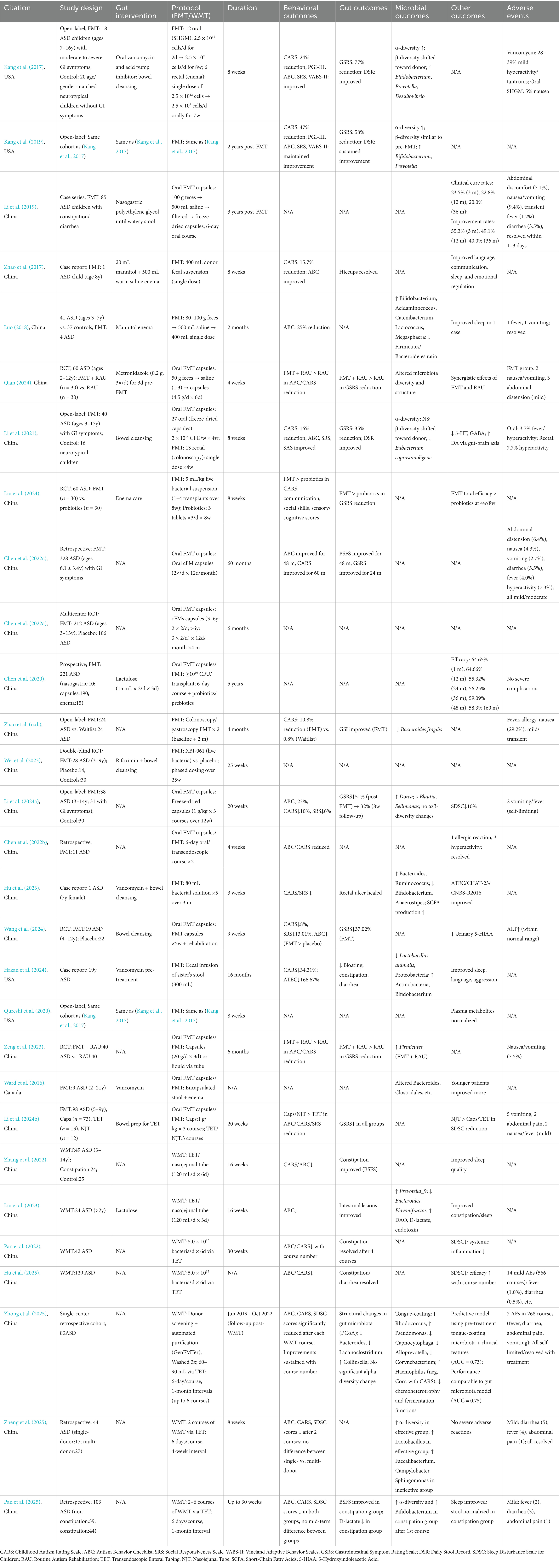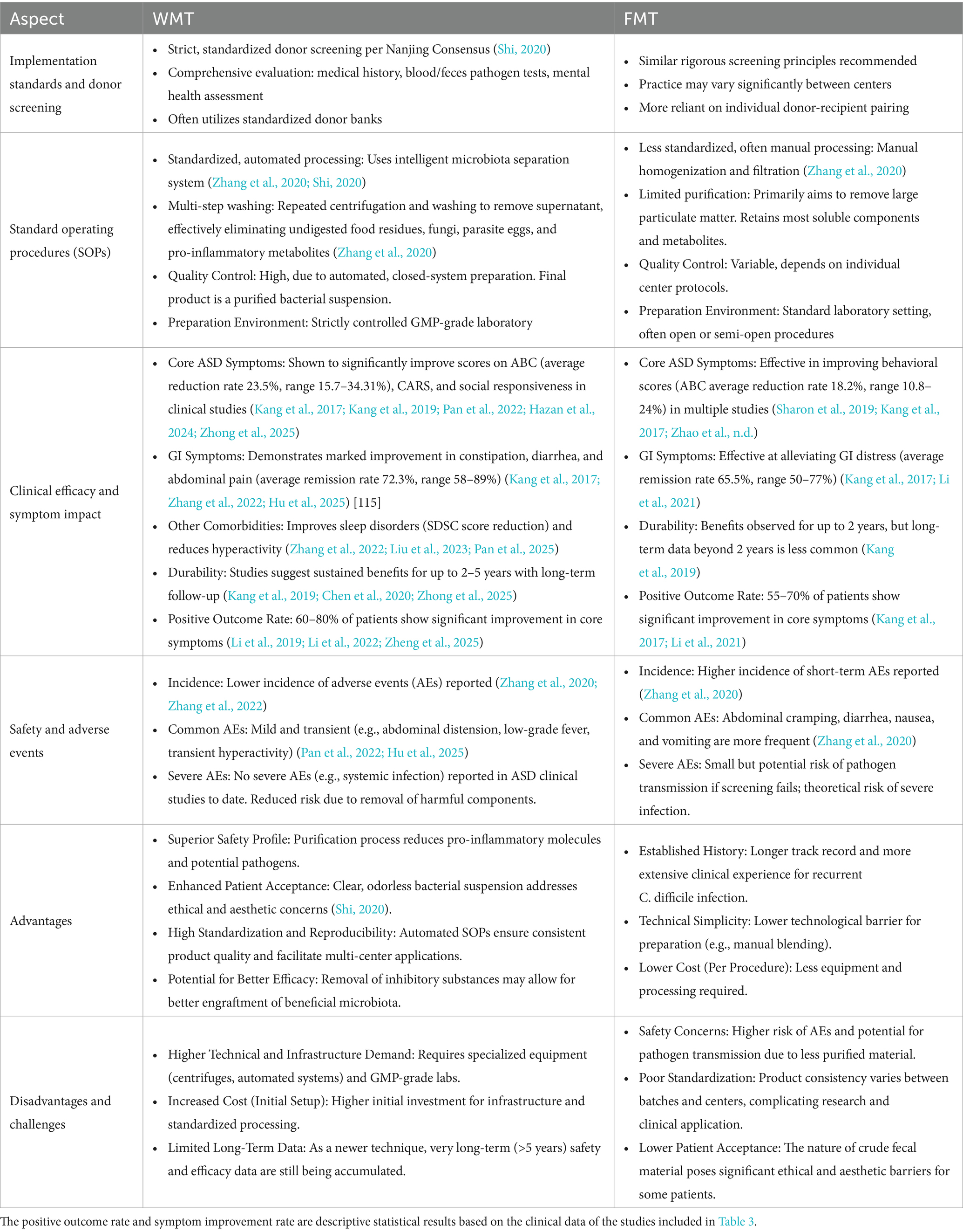 As an emerging therapeutic approach, WMT has garnered significant attention in recent years for treating autism spectrum disorder (ASD), with a growing body of clinical studies specifically investigating its use. These studies, summarized in Table 3, suggest that WMT can alleviate core behavioral symptoms, gastrointestinal distress, and comorbidities in autistic patients (Kang et al., 2017; Kang et al., 2019; Li et al., 2019; Zhao et al., 2017; Luo, 2018; Qian, 2024; Li et al., 2021; Liu et al., 2024; Chen et al., 2022c; Chen et al., 2022a; Chen et al., 2020; Zhao et al., n.d.; Wei et al., 2023; Li et al., 2024a; Chen et al., 2022b; Hu et al., 2023; Wang et al., 2024; Hazan et al., 2024; Qureshi et al., 2020; Zhang et al., 2022; Liu et al., 2023; Pan et al., 2022; Li et al., 2022; Zeng et al., 2023; Ward et al., 2016; Li et al., 2024b; Hu et al., 2025) (see Table 3). Multiple studies on the efficacy and safety of WMT have shown that, multiple studies demonstrate that WMT significantly improves autism-like behaviors, sleep disturbances, stool consistency, gastrointestinal symptoms, and systemic inflammation in ASD patients (Pan et al., 2022). Concurrently, WMT shifts the gut microbiota and metabolic profiles of ASD patients toward beneficial directions. Research methodologies have evolved from open-label designs to multicenter, randomized, double-blind, placebo-controlled trials, enhancing rigor and comprehensiveness. For instance at Peking Union Medical College Hospital, over 100 children with ASD showed marked improvement following FMT-based therapy, with an efficacy rate nearing 80% (Li et al., 2022), and no severe complications were observed during treatment. In terms of the impact of WMT on the Gut Microbiota, Post-WMT, ASD patients exhibit increased gut microbiota diversity, aligning closer to donor profiles (Kang et al., 2017; Kang et al., 2019; Hu et al., 2023). Notably, FMT elevates the relative abundance of Bifidobacterium and Prevotella in the gut, both of which may confer therapeutic benefits for ASD (Kang et al., 2017; Kang et al., 2019). Long-Term Efficacy, studies indicate sustained effects of FMT for up to 2 years. Kang et al. (2019) reported persistent improvements in ASD and gastrointestinal symptoms over a two-year follow-up. Li Ning et al. followed 85 ASD cases for 3 years, observing a 78.8% response rate at 6 months, 71.9% at 1 year, and 60% efficacy at 3 years, with over 20% achieving clinical cure (Li et al., 2019). Chen et al. (2022c) and Chen et al. (2022a) documented maintained therapeutic effects on ABC (Autism Behavior Checklist) and BSFS (Bristol Stool Form Scale) scores for 48 months, with results comparable to initial outcomes at 60 months. Chen et al. (2020) reported efficacy in 7 out of 12 ASD patients during a 60-month follow-up. Among the adverse events of WMT, most adverse events during WMT are mild to moderate, including abdominal distension, nausea, vomiting, diarrhea, fever, and hyperactivity. These resolved with temporary treatment suspension or symptomatic management, with no severe adverse events reported. Intriguingly, Ward et al. (2016) found WMT more effective in younger ASD patients, while older children showed limited responses. Family donor microbiota may play a critical role in outcomes for older patients (Hazan et al., 2024), warranting further exploration. This age-dependent efficacy may stem from the immature gut microbiota structure in younger individuals, which is more susceptible to external modulation. Studies highlight enhanced efficacy when WMT is combined with routine rehabilitation training (RAU), surpassing RAU alone in alleviating clinical and gastrointestinal symptoms (Qian, 2024; Zeng et al., 2023). This underscores WMT’s potential to restore gut microbial balance and ameliorate ASD manifestations. Additionally, WMT demonstrated superior efficacy compared to probiotic treatments in ASD children (Liu et al., 2024). In terms of metabolite changes in WMT, Post-WMT, plasma metabolite profiles in ASD children align more closely with those of neurotypical children (Qureshi et al., 2020). WMT also significantly reduces urinary 5-HIAA (5-hydroxyindoleacetic acid) levels (Wang et al., 2024), regulate the intestinal flora by reducing toxic metabolites and enhancing detoxification effects (Liu et al., 2023), suggesting positive impacts on metabolic health. In terms of the WMT treatment course, it was found that WMT could improve ASD symptoms, gastrointestinal symptoms and sleep disorders, and multiple treatments could bring more significant improvements (Pan et al., 2022). Six treatments could bring significant improvements, and patients with gastrointestinal symptoms before treatment had better therapeutic effects (Hu et al., 2025), indicating that the number of WMT treatment courses also has a positive effect on children with ASD.