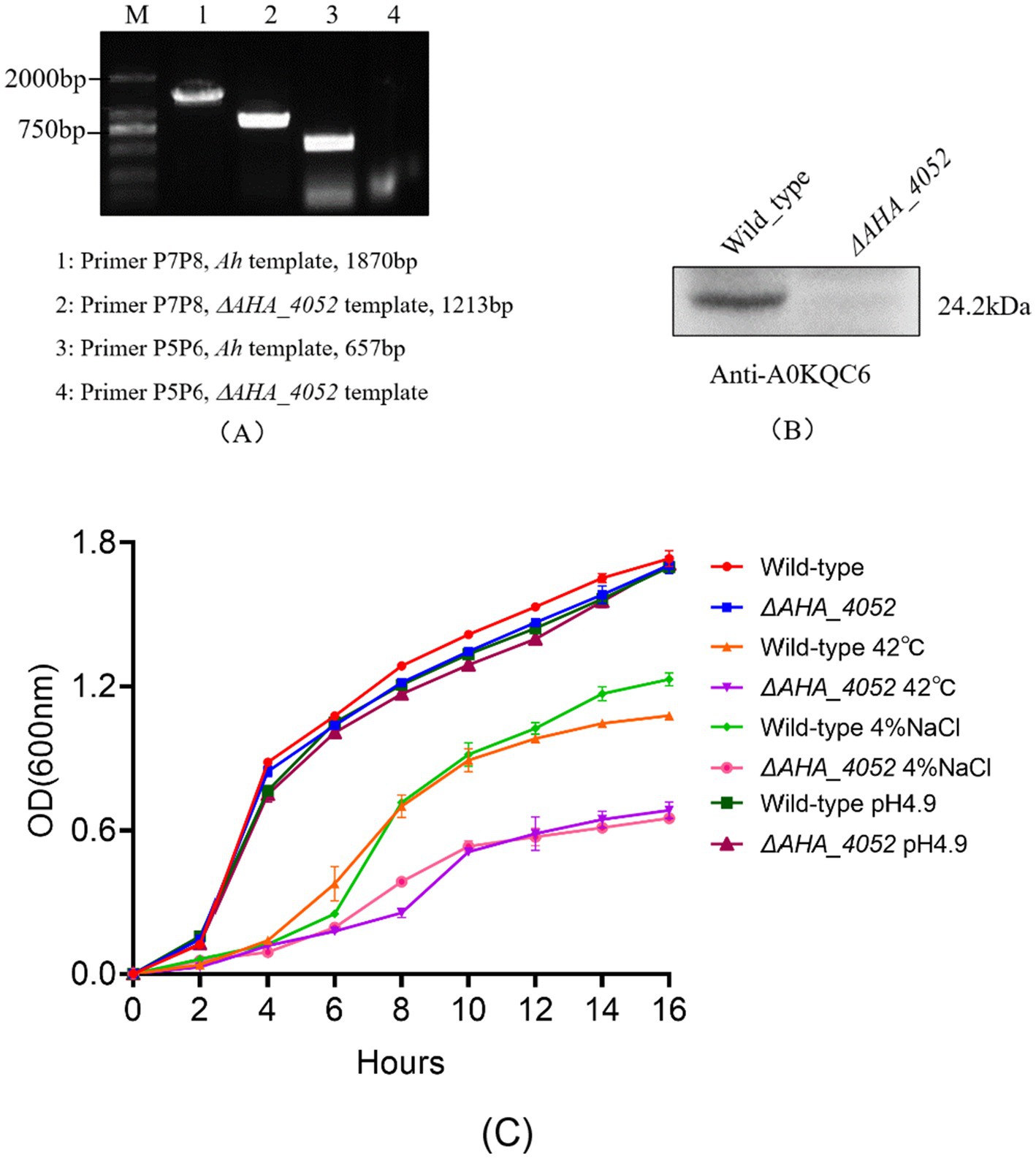 Figure 1. Validation of the ΔAHA_4052 mutant strain and its stress tolerance assays. (A) PCR and (B) Western blotting validation of the ΔAHA_4052 strain. (C) Growth curves of ΔAHA_4052 and wild-type strains under high temperature, high osmotic pressure, and acid (pH 4.9) environmental stress.