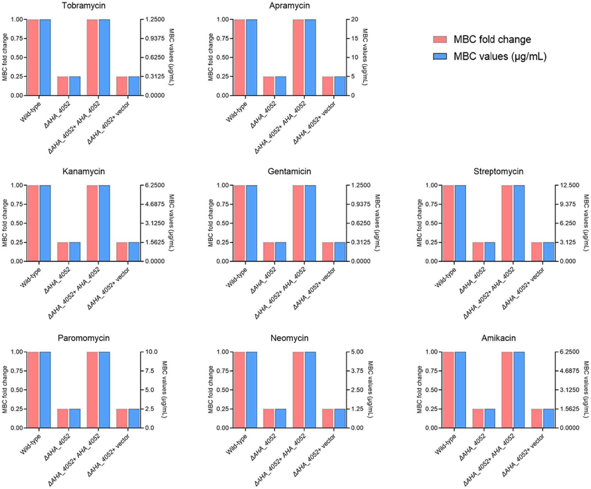 Figure 2. Minimum bactericidal concentrations (MBCs) of eight aminoglycoside antibiotics against wild-type and ΔAHA_4052 mutant strains of A. hydrophila. MBC values of the ΔAHA_4052 strain for each antibiotic are expressed as fold change relative to the wild-type strain (1 × MBC).