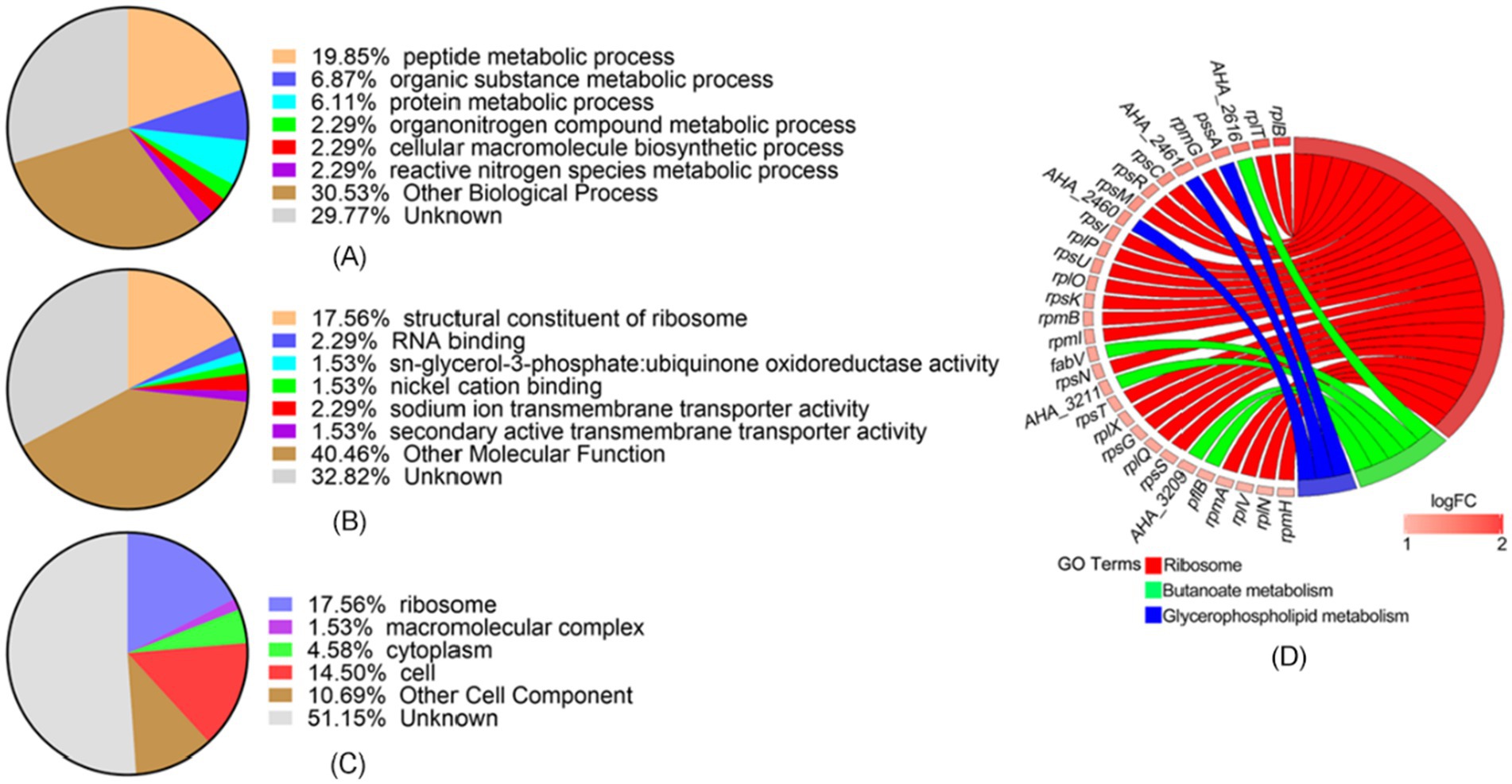 Figure 4. Functional annotation of differentially expressed proteins in the ΔAHA_4052 strain. Gene Ontology analysis of (A) biological processes, (B) molecular functions, and (C) cellular components. (D) The chord plot showed KEGG pathway enrichment analysis in the ΔAHA_4052 strain. The left color bar indicates the trend of protein expression, red represents up-expression genes, and blue represents down-expression. Colored bands link genes to corresponding KEGG terms.