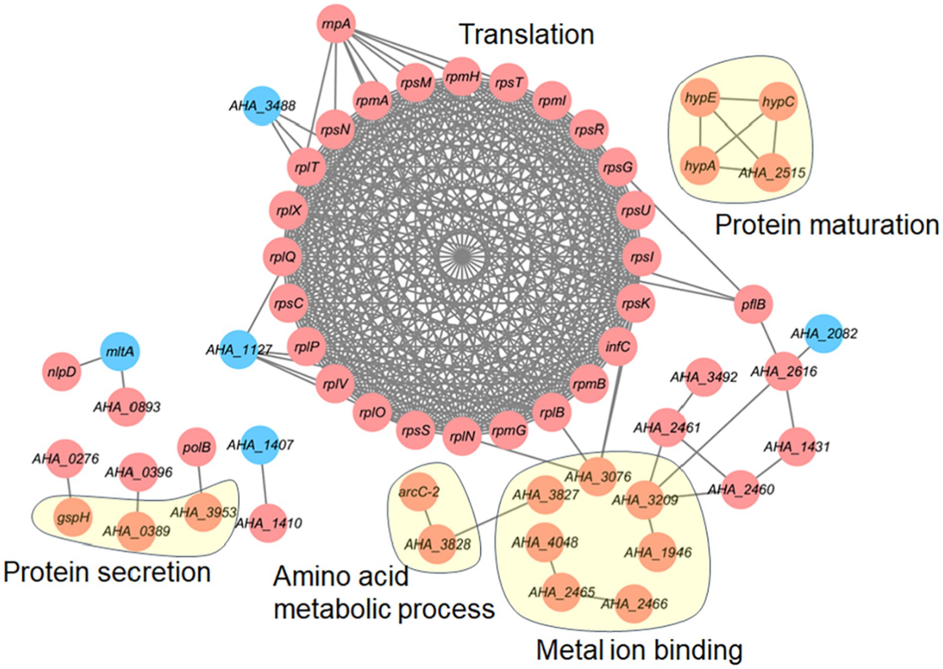 Figure 5. Protein–protein interaction network of differentially expressed proteins in the ΔAHA_4052 strain. The red circle represents upregulated proteins, and the blue circle represents downregulated proteins.