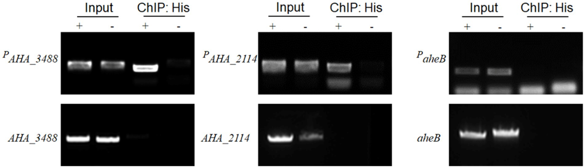 Figure 6. The chromatin immunoprecipitation and PCR assay of transcriptional regulation factor AHA_4052 with the promoters of AHA_3488, AHA_2114, and aheB genes. ΔAHA_4052 + AHA_4052 complementary strain was marked as “+”; ΔAHA_4052 + vector strain was marked as “–.” The chromatin of ΔAHA_4052 + AHA_4052 and ΔAHA_4052 + vector strains was immunoprecipitated with or without anti-His antibody (input or ChIP:His) and validated by PCR. The promoter fragment of the gene is labeled Pgene name.