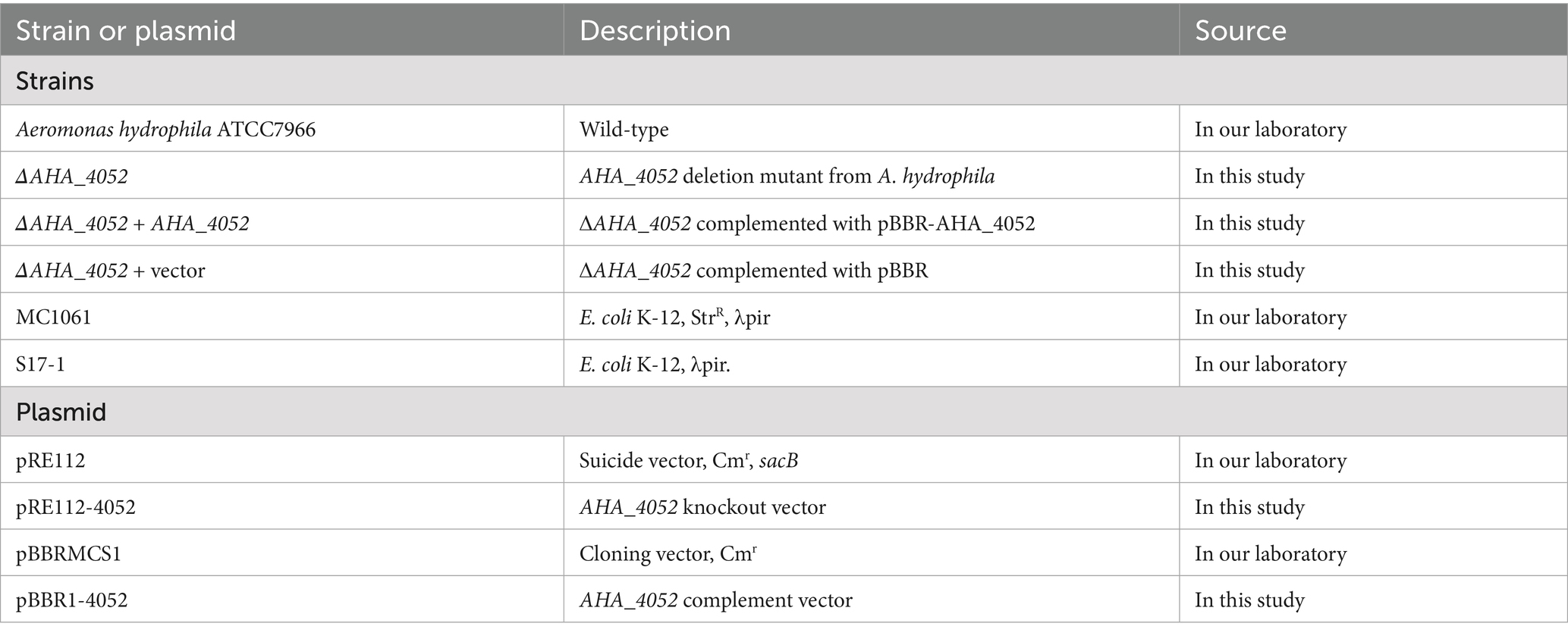 The AHA_4052 gene deletion strain was constructed using the suicide vector pRE112 and the homologous recombination principle (Li et al., 2018). The primers are listed in Supplementary Table 1. Briefly, ~500 bp upstream and downstream regions flanking the AHA_4052 gene were amplified from A. hydrophila genomic DNA and fused to the pRE112 plasmid. The recombinant plasmid was transformed into E. coli MC1061 competent cells. Verified positive plasmids were subsequently transferred to E. coli S17-1 cells. Conjugation between E. coli S17-1 (harboring the pRE112 recombinant vector) and wild-type A. hydrophila was performed at a 4:1 ratio to facilitate the first homologous recombination, integrating the vector into the A. hydrophila genome. This process was screened on an LB agar plate containing ampicillin (Amp) and chloramphenicol (Cm). Then, the second homologous recombination was completed by screening in LB medium supplemented with 20% sucrose. PCR and DNA sequencing were performed on single clones that are sensitive on the Cm plates. Finally, after approximately 20 generations of stable inheritance, the successfully verified ΔAHA_4052 strain was stored at −80 °C for subsequent experiments.