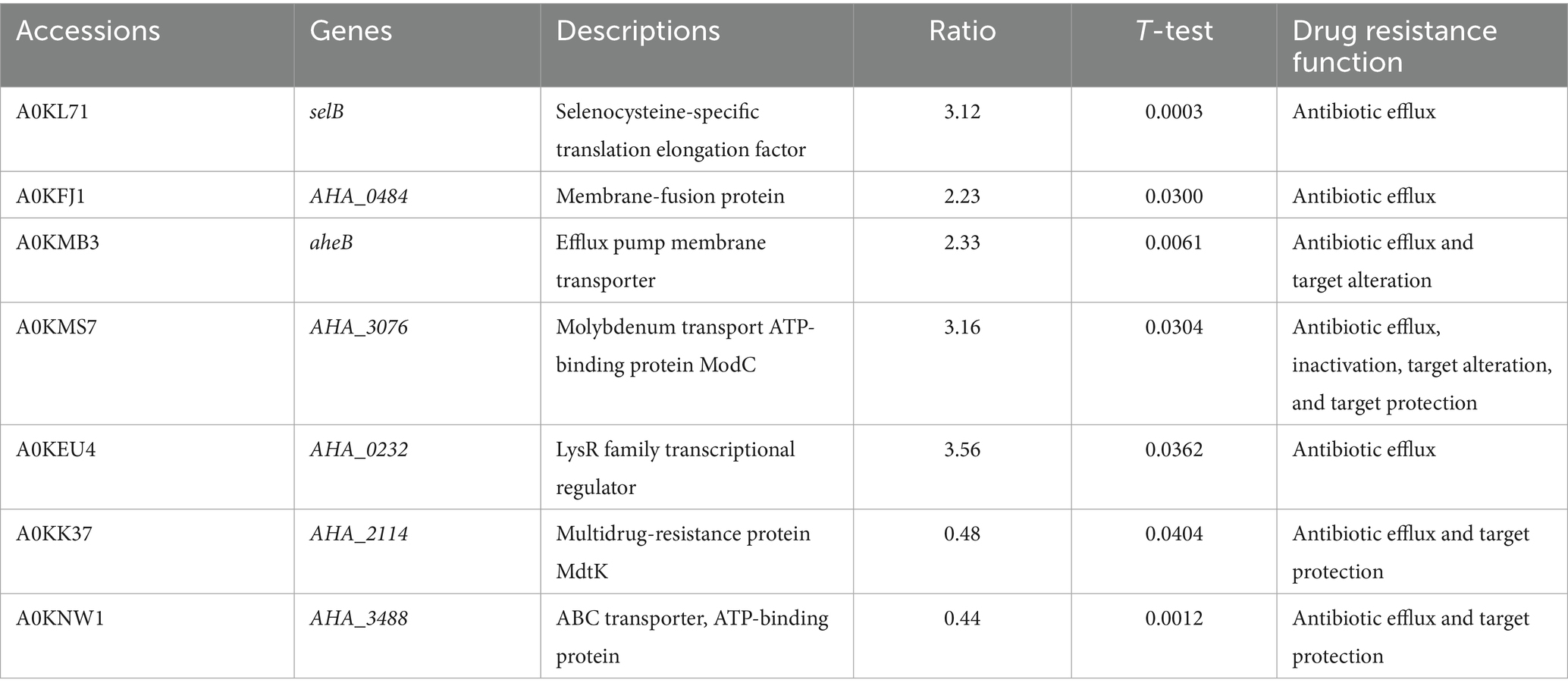 To investigate the antibiotic resistance mechanism of the transcriptional regulation factor AHA_4052, we identified differentially expressed antibiotic resistance genes (ARGs) in the ΔAHA_4052 mutant using the Comprehensive Antibiotic Research Database (CARD). Seven resistance genes were found to be directly or indirectly regulated by the transcriptional regulation factor AHA_4052, with five proteins (aheB, AHA_0484, selB, AHA_3076, and AHA_0232) showing increased abundance and two proteins (AHA_2114 and AHA_3488) exhibiting decreased abundance. These proteins mediate bacterial antibiotic resistance through mechanisms including efflux pumps, antibiotic inactivation, target alteration, and target protection (Table 2).