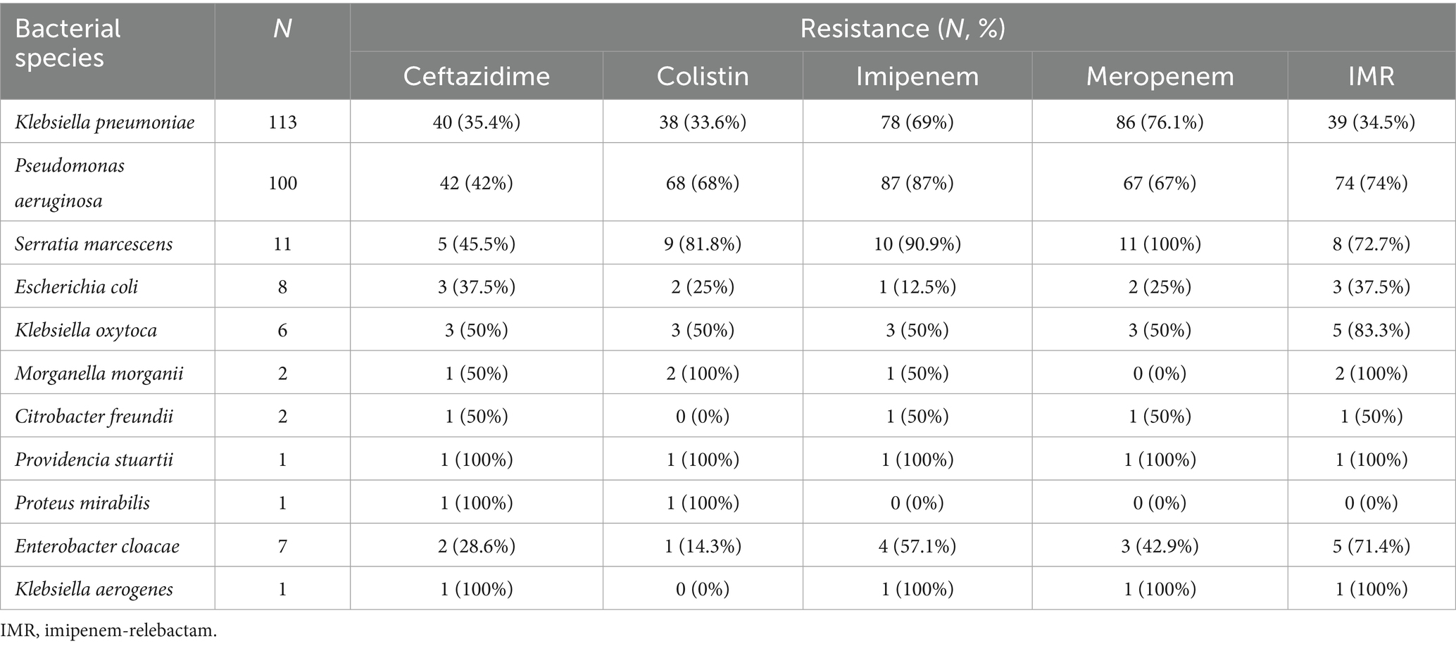Clinical isolates of Enterobacterales and P. aeruginosa were obtained from hospitalized patients demonstrating carbapenem resistance. Only one isolate per patient was considered to avoid duplication of data. Isolates were collected from blood, respiratory secretions, urine and other sources. Isolates were identified at the genus and species level using the VITEK® MS MALDI-TOF system (bioMérieux, France), a technology based on matrix-assisted laser desorption ionization time-of-flight mass spectrometry (MALDI-TOF). We screened for a broad panel of carbapenemase genes, including KPC, NDM, OXA-48-like, and the metallo-β-lactamases VIM, IMP, and SPM-1, using polymerase chain reaction (PCR) with specific primers and standardized amplification protocols. The susceptibility profile for imipenem–relebactam was determined by reference broth microdilution using the Sensititre™ Gram Negative RUO Susceptibility Testing Plate - MDRGNXXF (Thermo Fisher Scientific), interpreted by The European Committee on Antimicrobial Susceptibility Testing (2024) breakpoints. Quality control used appropriate reference strains and CLSI/EUCAST procedures (The European Committee on Antimicrobial Susceptibility Testing, 2024). Isolates that were negative for common carbapenemase genes but still resistant to carbapenems underwent next-generation sequencing (NGS) for the identification of novel resistance genes or mutations. Isolates resistant to carbapenems, polymyxin B, and fluoroquinolones were selected for NGS to identify resistance genes, virulence factors, and genetic structures. Libraries were prepared with Nextera XT and sequenced on an Illumina MiSeq (2 × 250 bp). Reads were trimmed (Trimmomatic) and assembled (SPAdes v3.14). Assemblies were screened for resistance genes (ResFinder 4.1), plasmid replicons (PlasmidFinder), and MLST. Kleborate assessed hypervirulence loci for K. pneumoniae; in P. aeruginosa we examined oprD and efflux regulators (e.g., mexR, nalD).
