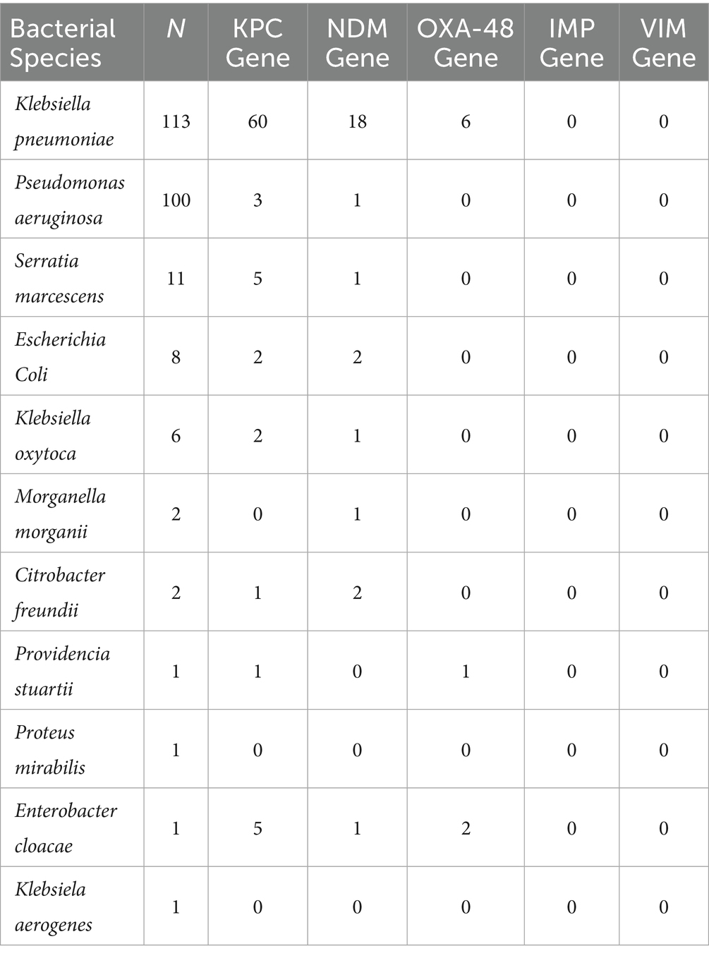 Molecular analysis revealed the presence of several carbapenemase genes. In K. pneumoniae, the blaKPC gene was detected in 60 isolates, blaNDM in 18, and blaOXA-48 in 6. Among P. aeruginosa, only three isolates carried blaKPC and one had blaNDM. The overall predominance of blaKPC among Enterobacterales reflects its role as the main resistance mechanism in this setting. No isolates tested positive for blaIMP or blaVIM. No isolate was found to carry the blaSPM (SPM-1) metallo-β-lactamase gene (Table 2). Notably, no isolate was found to carry more than one carbapenemase gene simultaneously (e.g., we did not observe co-production of KPC and NDM in the same strain).
