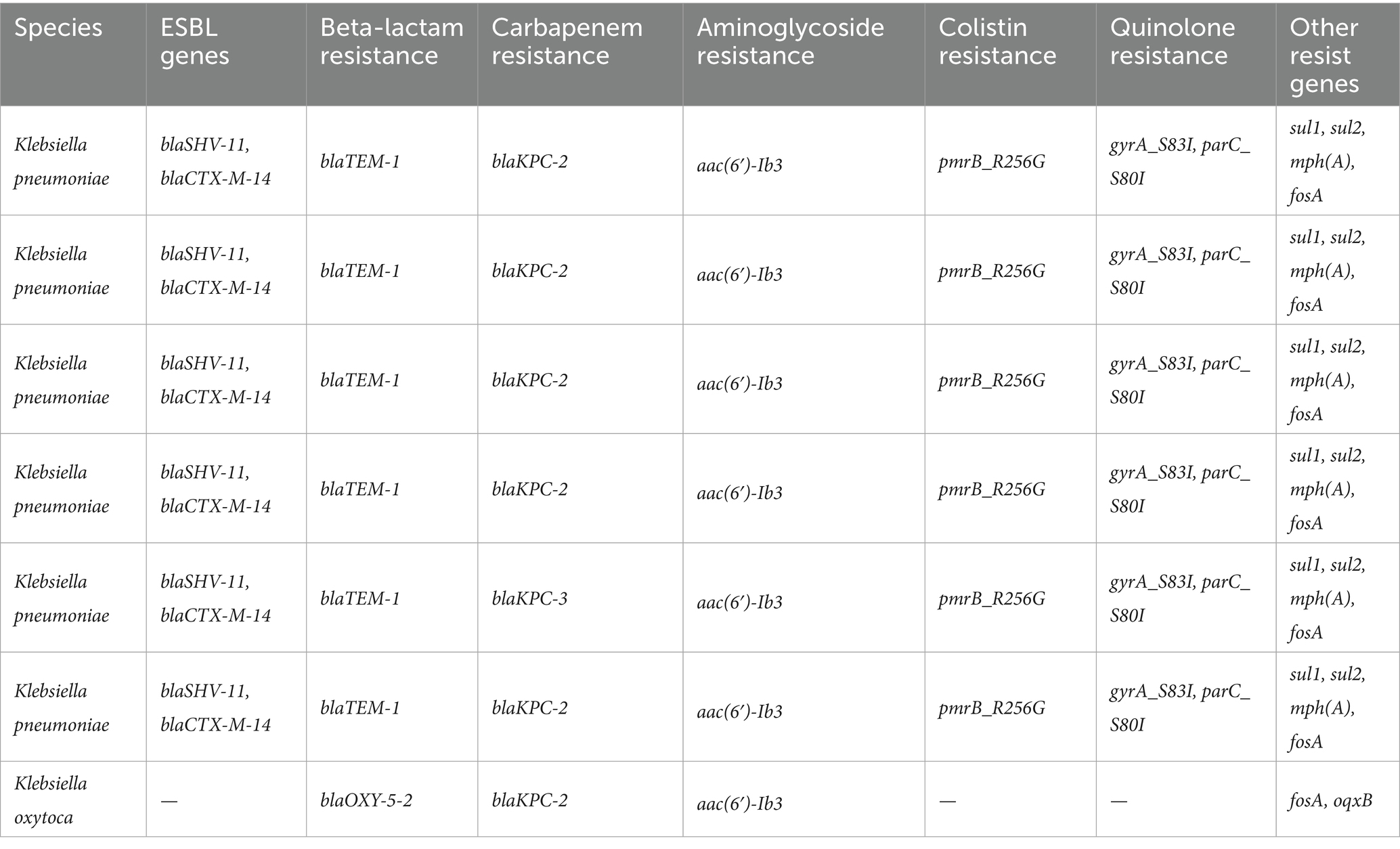 Next,-generation sequencing (NGS) performed on a subset of multidrug-resistant K. pneumoniae and K. oxytoca isolates revealed the presence of multiple resistance determinants. We selected 20 isolates (15 carbapenemase-producers spanning KPC, NDM, OXA-48-like, VIM, IMP; and 5 carbapenemase-negative) for WGS. All sequenced K. pneumoniae isolates carried blaKPC-2 or blaKPC-3, and co-harbored ESBL genes such as blaSHV-11 and blaCTX-M-14. Resistance to aminoglycosides [aac(6′)-Ib3], colistin (pmrB_R256G), and quinolones (gyrA_S83I, parC_S80I) was also common (Table 4).