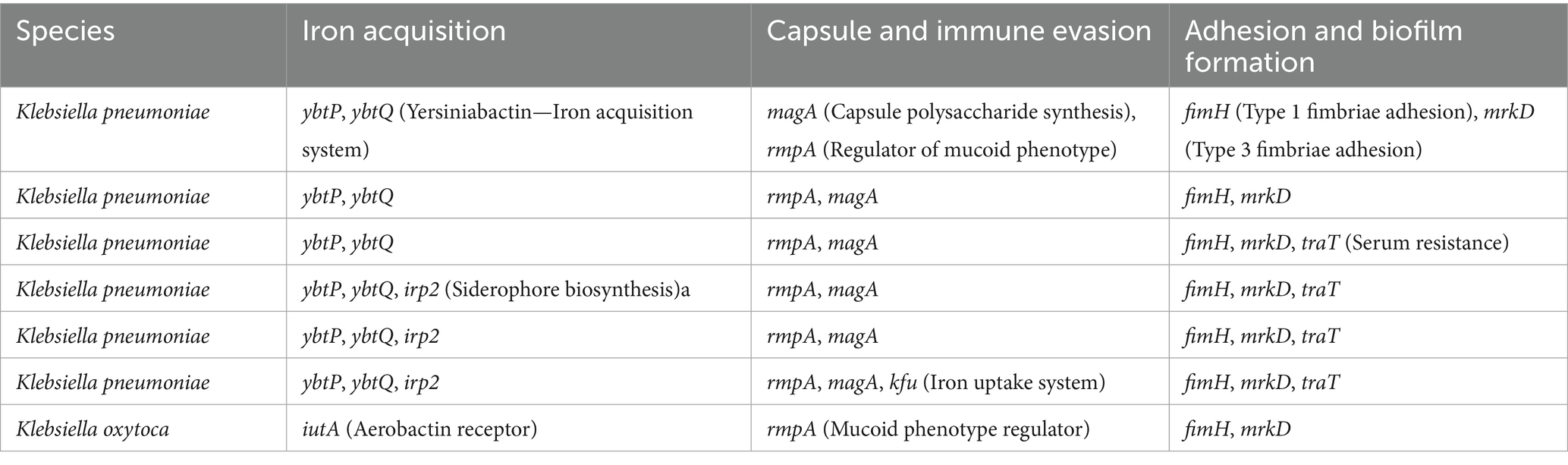 Virulence gene analysis identified several important markers in K. pneumoniae, including ybtP and ybtQ (iron acquisition), magA and rmpA (capsular synthesis and immune evasion), and fimH and mrkD (adhesion). Some isolates also carried traT, a serum resistance gene, and irp2, a siderophore biosynthesis component. K. oxytoca presented a similar profile, with iutA and rmpA among the detected virulence factors (Table 5).
