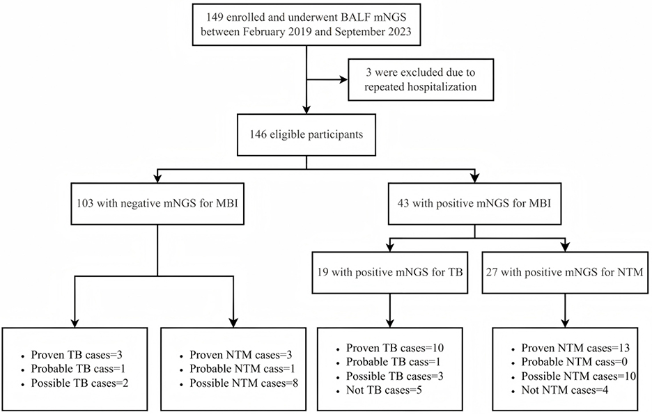 Figure 1. Flowchart of case selection process. The flow diagram illustrates patient inclusion and exclusion throughout the study. A total of 146 PWH who underwent BALF mNGS for suspected pulmonary infection were screened. Final diagnostic classification was based on the CRS for pulmonary MBI, including TB and NTM. PWH, persons with HIV; BALF, bronchoalveolar lavage fluid; mNGS, metagenomic next-generation sequencing; CRS, composite reference standard; MBI, mycobacterial infection; TB, tuberculosis; NTM, non-tuberculous mycobacteria.