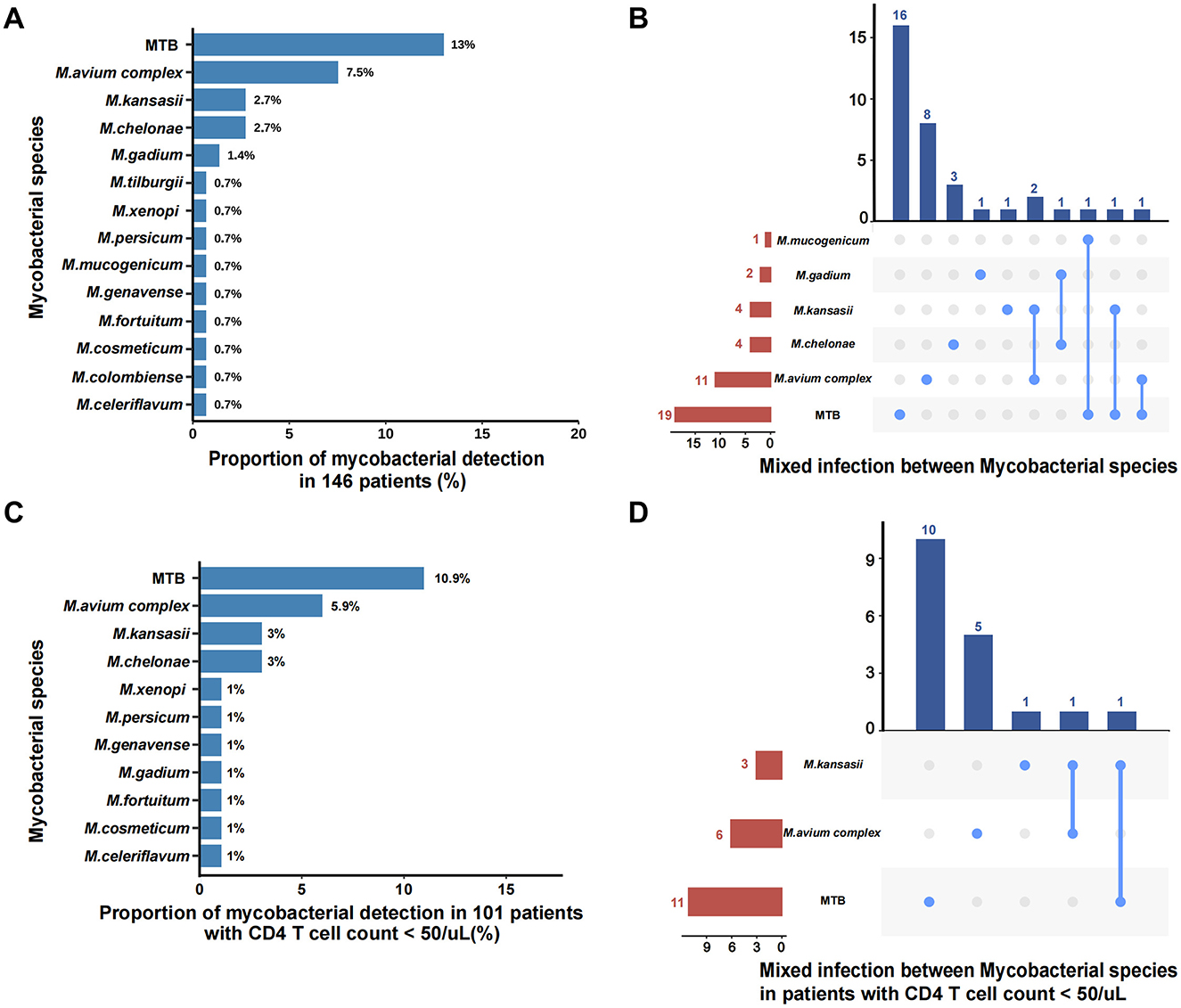 Figure 2. Distribution of MBI subspecies by BALF mNGS. (A) All the mycobacterial species detected by BALF mNGS in 146 patients; (B) Mixed infection between Mycobacterial species in all patients; (C) All the mycobacterial species detected by BALF mNGS in 101 patients with CD4 counts <50 cells/μL; (D) Mixed infection between mycobacterial species in patients with CD4 counts < 50 cells/μL. MTB, Mycobacterium tuberculosis.