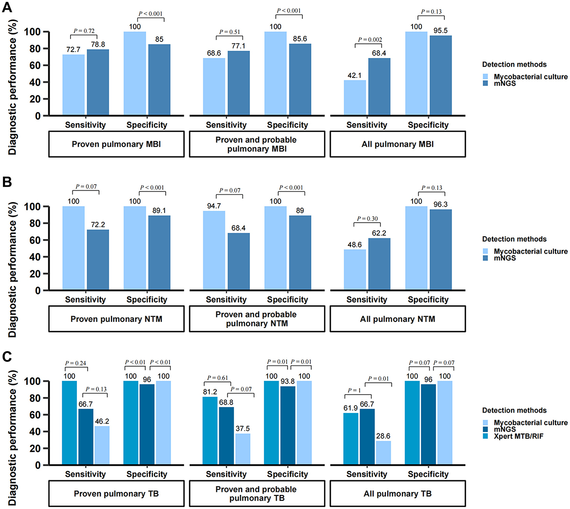 Figure 3. Diagnostic performance of mNGS for pulmonary mycobacterial infection. (A) Comparison of diagnostic performance: BALF mNGS vs. mycobacterial culture in diagnosing pulmonary mycobacterial infection; (B) Comparison of diagnostic performance: BALF mNGS vs. mycobacterial culture in diagnosing pulmonary NTM infection; (C) Comparison of diagnostic performance: BALF mNGS vs. Xpert MTB/RIF assay vs. mycobacterial culture in diagnosing pulmonary TB infection. The vertical axis represents the percentage (%) of each diagnostic metric, including sensitivity and specificity. These metrics were calculated using the composite reference standard. BALF, bronchoalveolar lavage fluid; mNGS, metagenomic next-generation sequencing; MBI, mycobacterial infection; TB, tuberculosis; NTM, non-tuberculous mycobacteria.