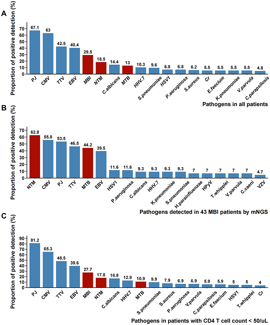 Figure 4. Pathogens detected by BALF mNGS. (A) The proportion of each pathogen reported by mNGS in all patients; (B) The proportion of each pathogen reported by mNGS in 43 MBI patients; (C) The proportion of each pathogen reported by mNGS in patients with CD4 counts <50 cells/μL. PJ, Pneumocystis jirovecii; CMV, Cytomegalovirus; TTV, Torque teno virus; EBV, Epstein-Barr virus; MBI, mycobacterial infection; NTM, non-tuberculous mycobacteria; MTB, Mycobacterium tuberculosis; HHV.7, Human herpesvirus-7; HSV1, Herpes simplex virus-1; Cr, Cryptococcus neoformans; HPyV, Human polyomavirus; VZV, Varicella-zoster virus.